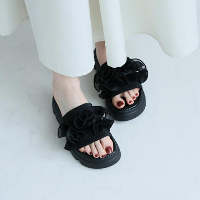 ボリュームのシアーフリルが華やかな厚底サンダル!