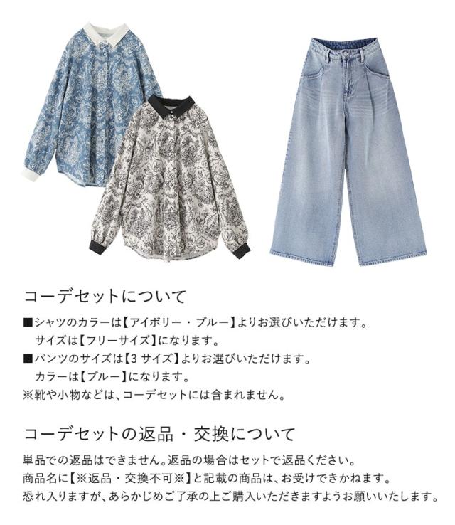 『トワルドジュイ柄シャツ×タックデニムパンツコーデ2点SET』【メール便不可】【40】[2点コーデセット 2026 レディース シャツ 長袖 トップス ブラウス トワルドジュイ柄 パンツ ボトムス デニム ジーンズ]