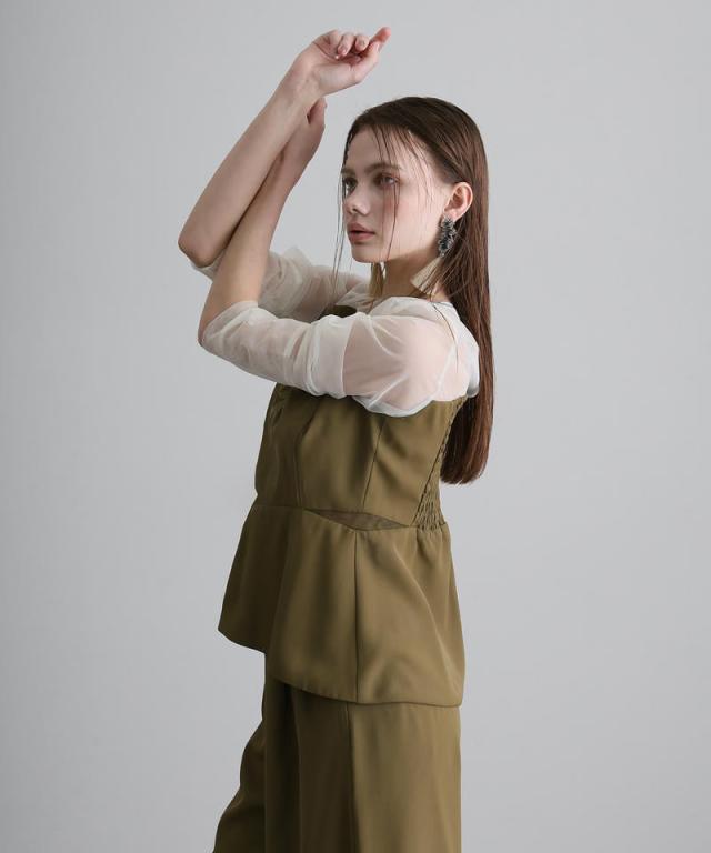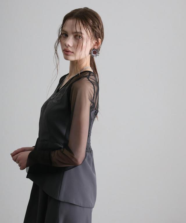 ウエストサイドのチュールスリットとペプラムシルエットが、軽やかで洗練された雰囲気を演出します。