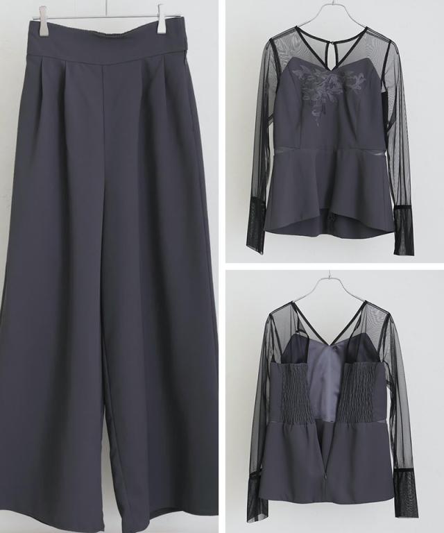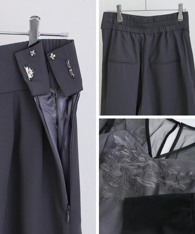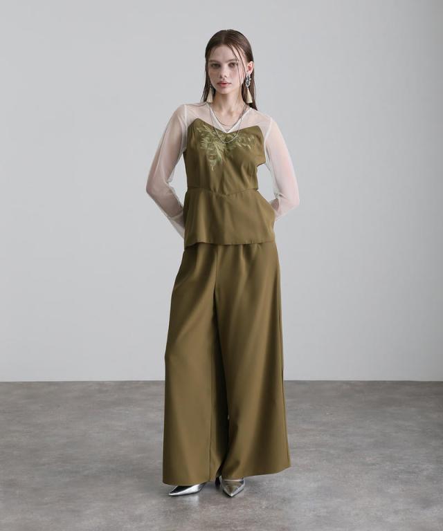 上品な落ち感のツイル素材に、繊細な刺繍とチュールを組み合わせた洗練セットアップ。
