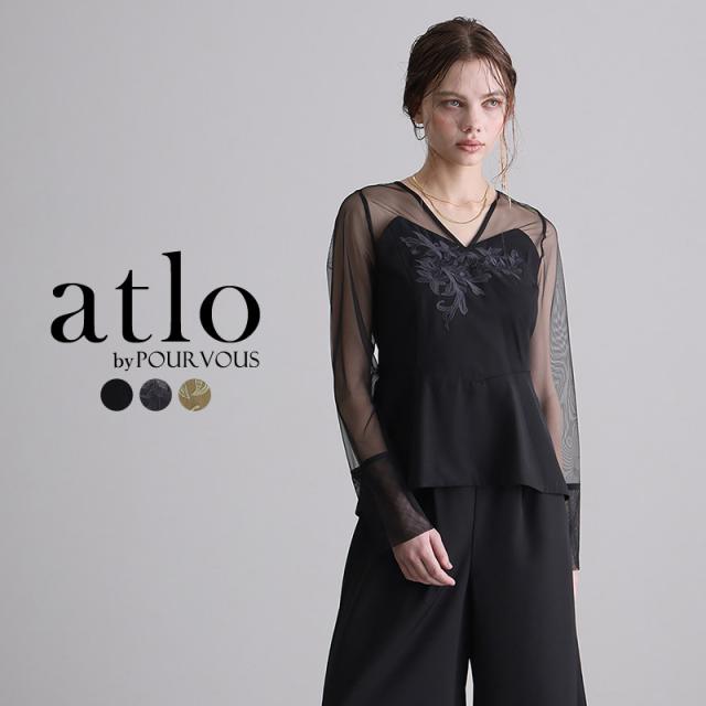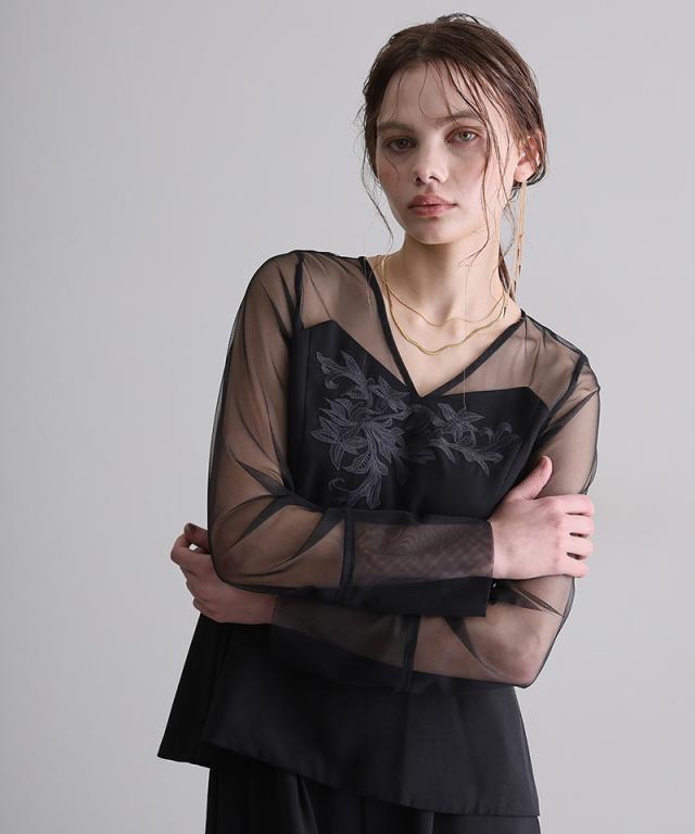 デコルテの刺繍とヨークから袖にかけてのチュールが上品で女性らしい印象に。