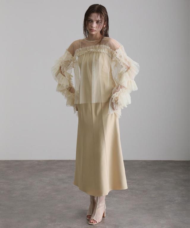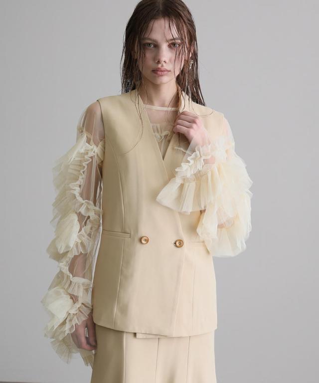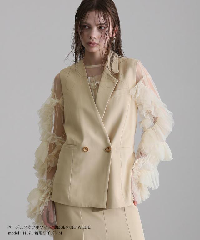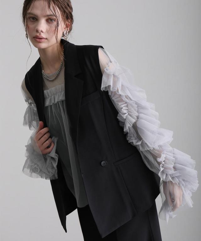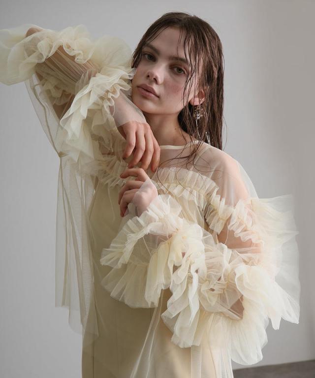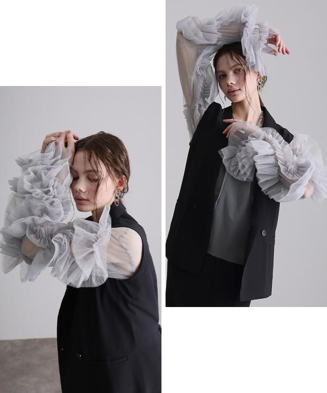 ふんわりとしたチュール袖が女性らしい華やぎをプラス。