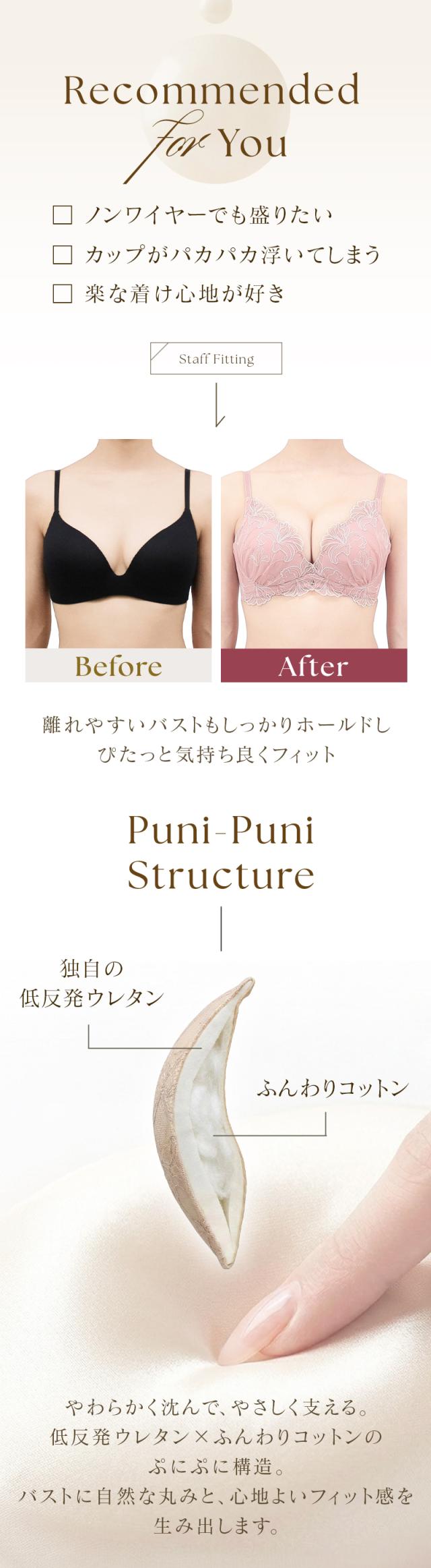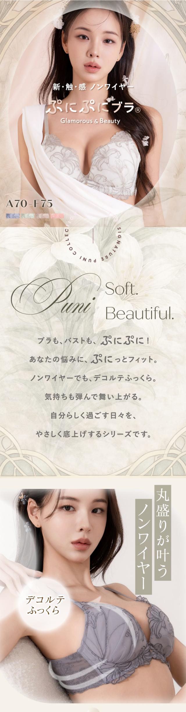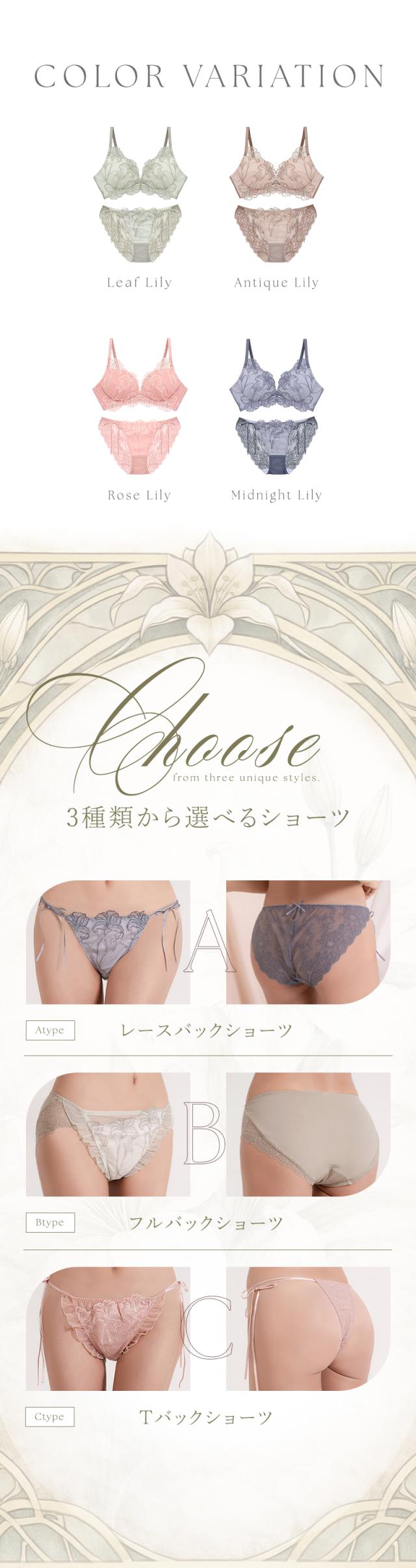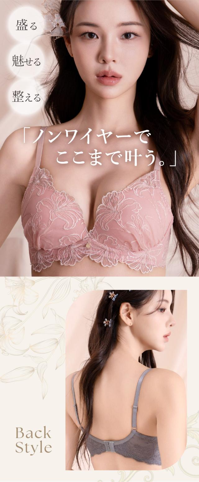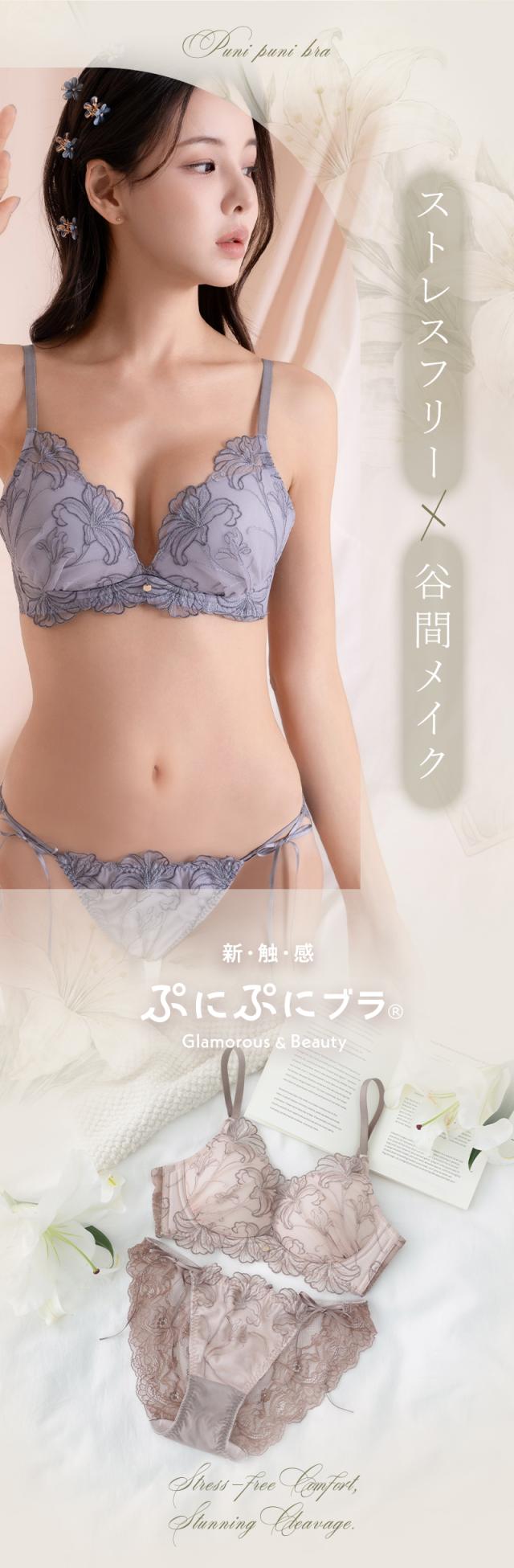 tu-hacci Bra&Shorts Collection ブラ&ショーツ / 計2点セット 新触感ノンワイヤー 〜ぷにぷにブラシリーズ〜 ブラも、バストも、ぷにぷに! ノンワイヤーでも、デコルテふっくら。 気持ちも弾んで舞い上がる。 自分らしく過ごす日々を、やさしく底上げするシリーズです。 アートを纏い、身体に描く 《ぷにぷにブラ|Canvas Me》リリィアートブラ&ショーツ 【こんな方におすすめ】 ・ノンワイヤーでも盛りたい方 ・楽な着け心地がお好きな方 ・カップ浮きが気になる方 ■ 理想を叶える「ぷにぷに」の魔法 ・空気を纏う、3層構造カップ 独自開発のモールドカップが、バストの丸みに溶け込むようにフィット。 ・重力に負けない、上向きシルエット 下から優しく押し上げ、包み込むようにホールド。ノンワイヤーとは思えないほどのバスト位置をキープします。 ・デコルテまで愛おしく、ぷにぷに。 驚くほど軽い着け心地で、ふんわり柔らかなデコルテラインを演出。 ・パーソナルに寄り添う、4列ホック アンダーの細かな変化にも対応。体調や気分に合わせたベストなフィット感に。 ・背中の段差もフラットに U字バックデザインで、すっきり見せる仕様に。 ■ 凛とした大人のフェミニンを、身体に描くデザイン 日常に、アートを添えるようなランジェリー。 ユリの花が肌を引き立てる、繊細で美しい刺繍の仕上がり。 アールヌーヴォーの曲線美を纏うように、上品に、しなやかに、静かに余韻を残す1枚。 ■ショーツは3タイプから選べる フルバックタイプ…ベーシックなデザインでデイリー使いにおすすめ。 レースバックタイプ…サイドのリボンは、ゴム部分をカットすることで「完全な手結び仕様」へのカスタマイズも◎ Tバックタイプ…タイトな服でもラインが響かず、後ろ姿までアーティスティックに。 フルバックタイプとTバックタイプにはフロントにフリルをあしらい、可憐な装いに。 レースバックタイプは繊細なレースでヒップを美しく彩ります。 ≫ ギフトラッピングはこちら ≪ |