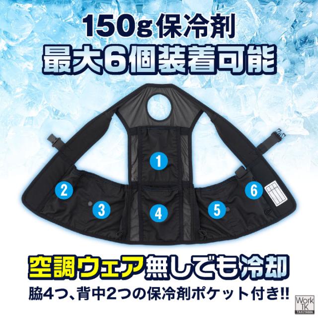 ペルチェホール付きで最大6個の150g保冷剤を装着出来るので、空調ウェアが使えない場所でも◎。