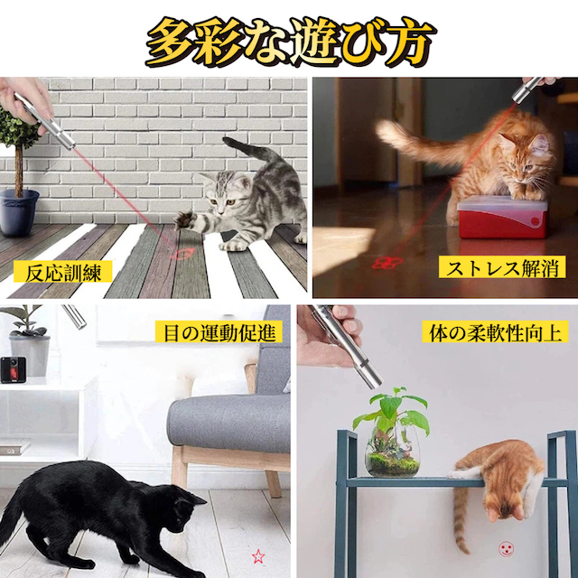 このLEDポインターは、反応訓練やストレス解消だけでなく、目の運動促進や体の柔軟性向上にも役立ちます。猫ちゃんの好奇心を刺激しながら、健康的な運動を促すことができるため、室内飼いの猫ちゃんにもぴったりです。| 商品詳細 | |