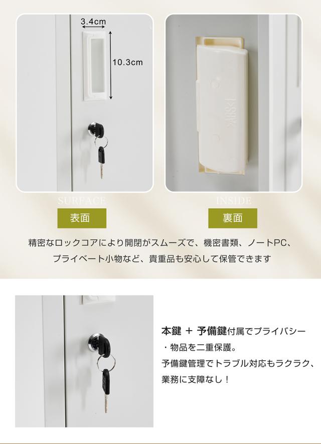 【各扉2本鍵付き、プライバシーを厳守】各扉に本鍵1本と予備鍵1本を標準装備し、物品の安全を二重に保障します。精密なロックコアにより開閉がスムーズで、機密書類、ノートPC、プライベート小物など、貴重品も安心して保管できます。本鍵 + 予備鍵付属でプライバシー・物品を二重保護。予備鍵管理でトラブル対応もラクラク、業務に支障なし!