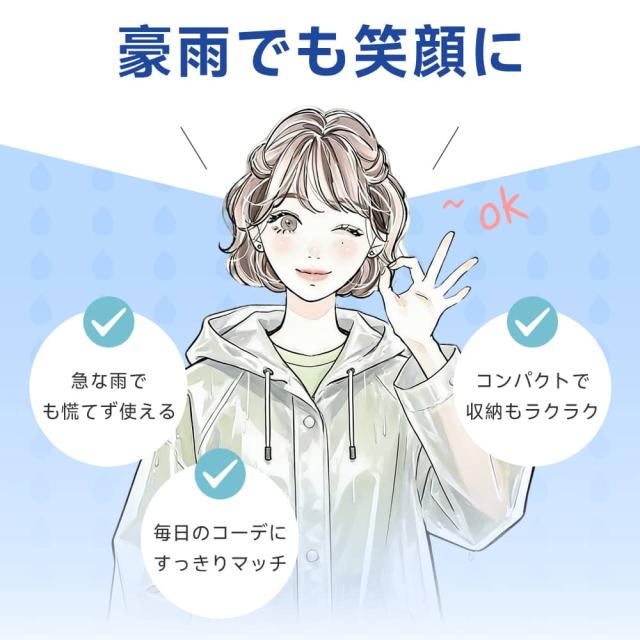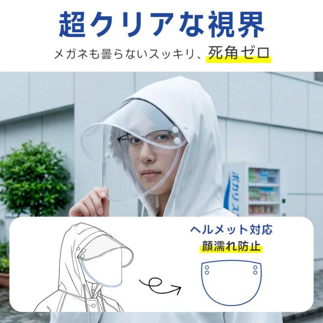 透明二重つばでクリアな視界を確保し、雨・風・雪から顔を保護。調節可能フード&収納袋付き。