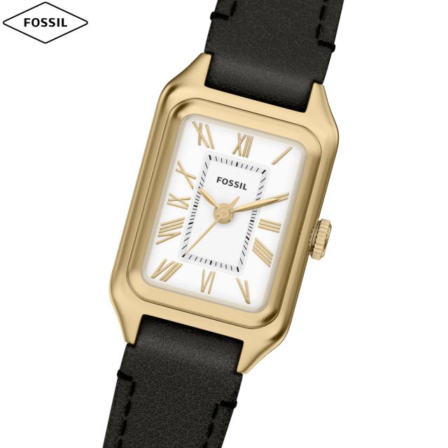 ゴールドトーンの小ぶりなレクタングルケースが、洗練された三針デザインを備えたすっきりとしたホワイトのサテン仕上げのダイヤルを縁取ります。ブラックのレザーストラップが繊細なコントラストを添え、シングルプロングバックルで簡単に調節できます。【フォッシル FOSSIL 2026 新作】