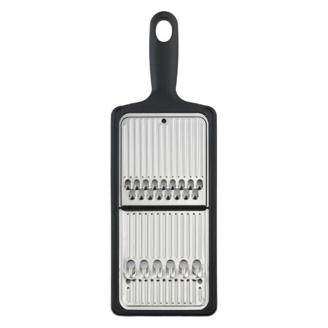 1枚で「千切り」と「太千切り」を使い分けられる、便利な2WAY仕様のステンレス千切り・しりしりです。表裏で刃の形状が異なり、細い千切りから太めのしりしりまで、大根・きゅうり・にんじんなど幅広い野菜に対応します。