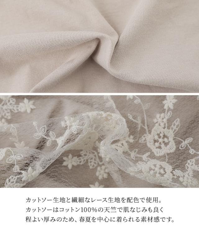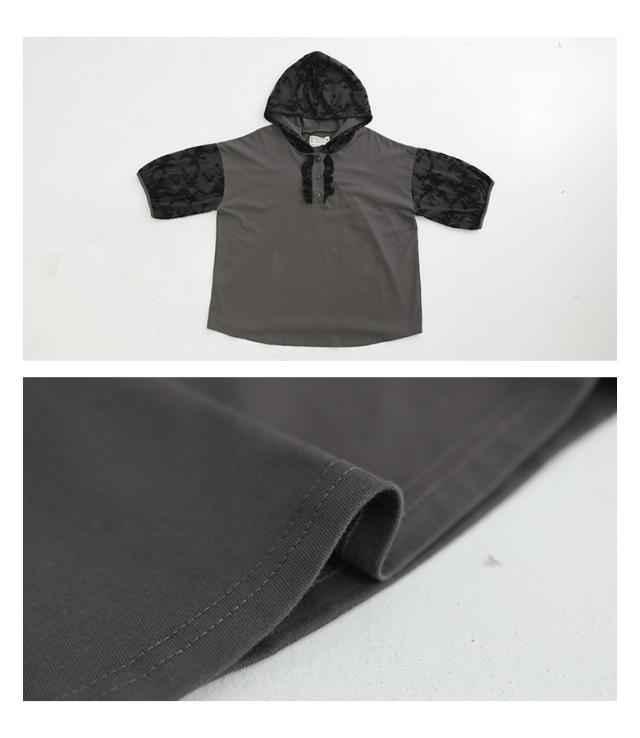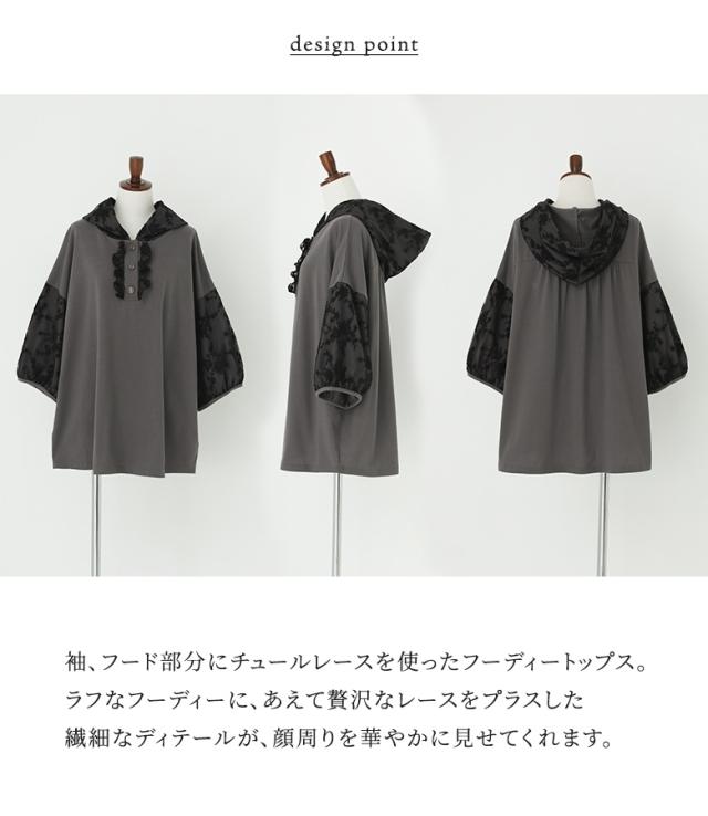 <春新作>『レースフードプルオーバー』【メール便不可】【20】[カットソー 半袖 レディース トップス 春 夏 Tシャツ フード付き 五分袖 フーディー チュール レース 異素材 フリル 綿100% プルオーバー]