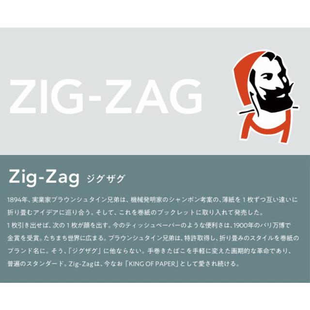1枚引き出せば、次の1枚が顔を出す。今のティッシュペーパーのような便利さは、1900年のパリ万博で 金賞を受賞。たちまち世界に広まる。ブラウンシュタイン兄弟は、特許取得し、折り畳みのスタイルを巻紙の ブランド名に。そう、「ジグザグ」に他ならない。手巻きたばこを手軽に変えた画期的な革命であり、 普遍のスタンダード。Zig-Zagは、今なお「KING OF PAPER」として愛され続ける。
