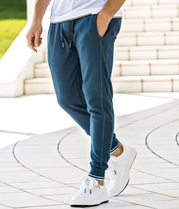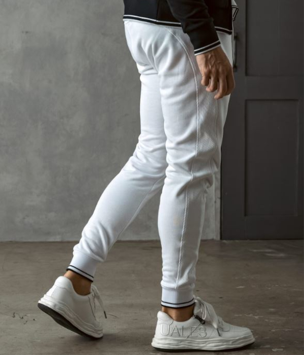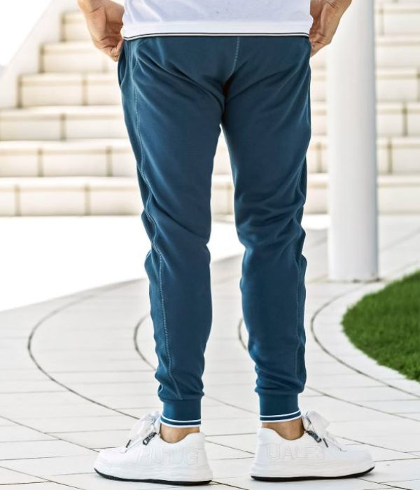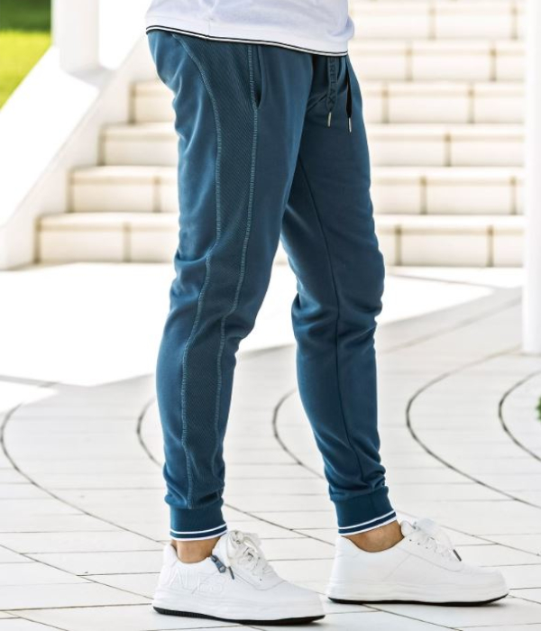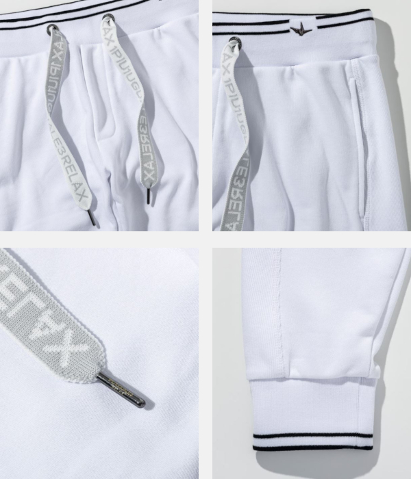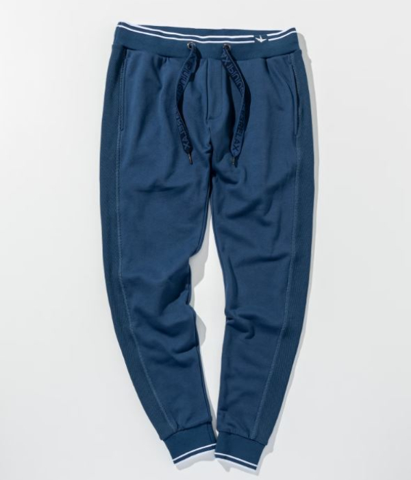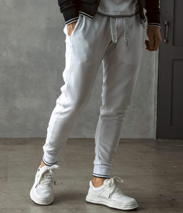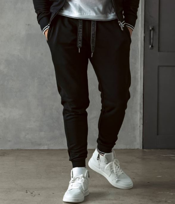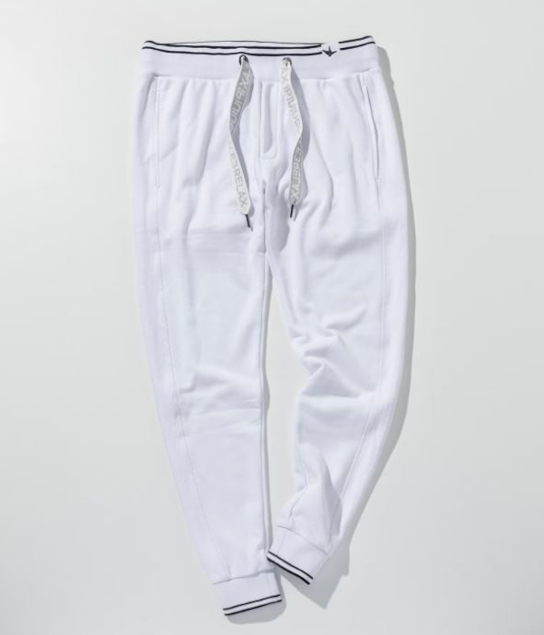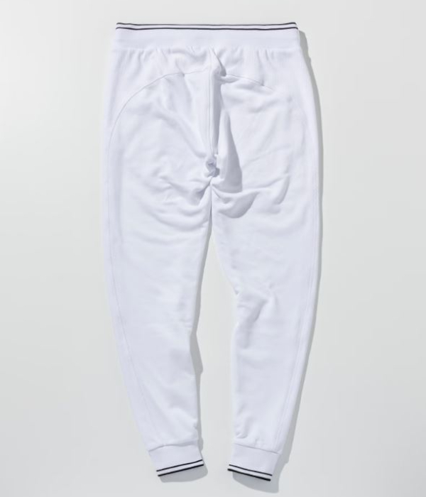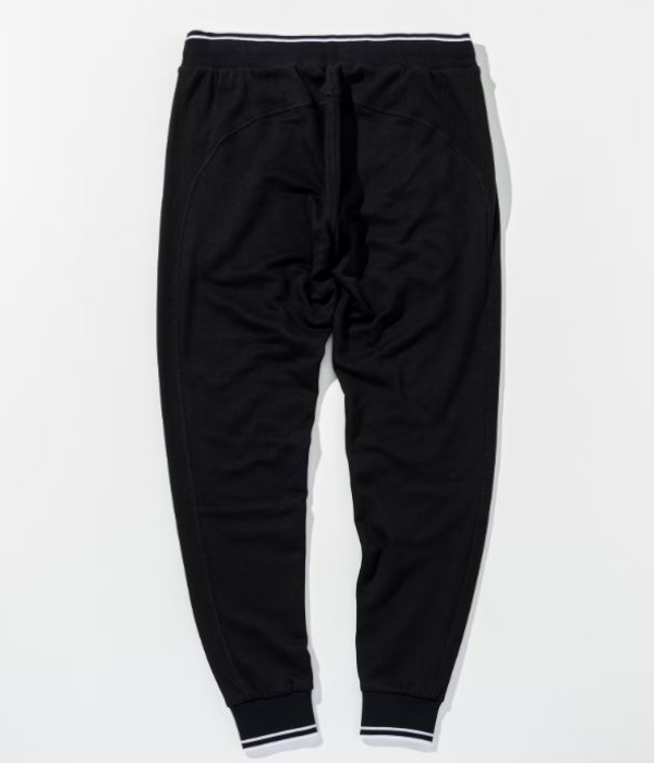 裾口とウエストにラインデザインを施したスウェットパンツ。
