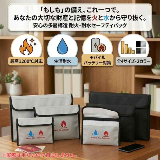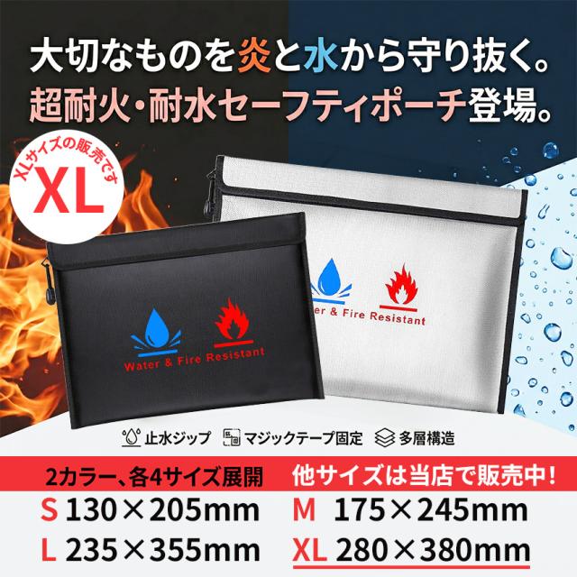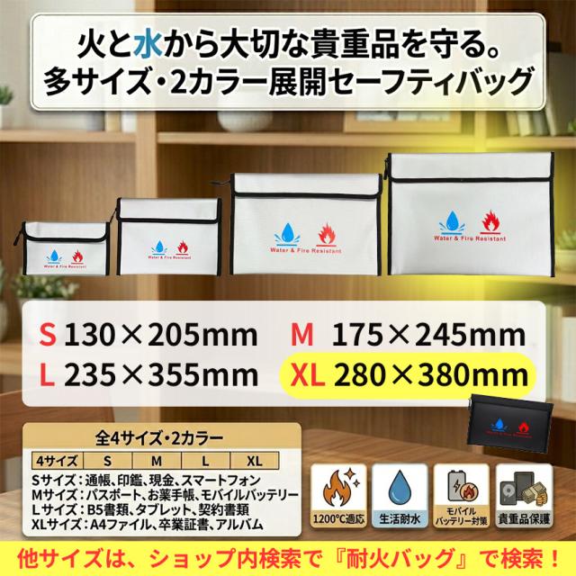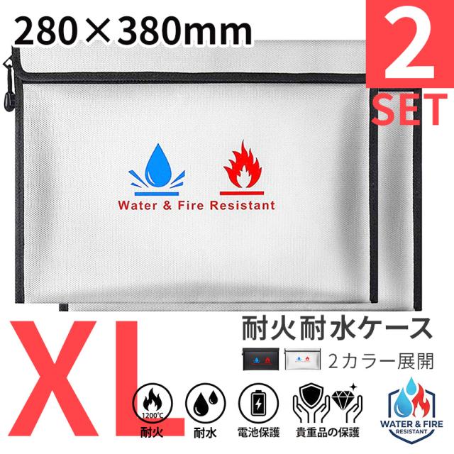 2個セット 耐火バッグ 防水 防火 セーフティバッグ XLサイズ 貴重品保管ケース 書類収納 A4 パスポート 通帳 印鑑 モバイルバッテリー 発火対策 防災 火災対策 薄型 マチなし ダブルロック 止水ジップ ブラック シルバー リチウムバッテリー 金庫 強力マジックテープ