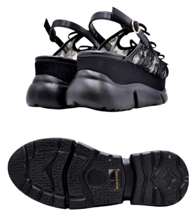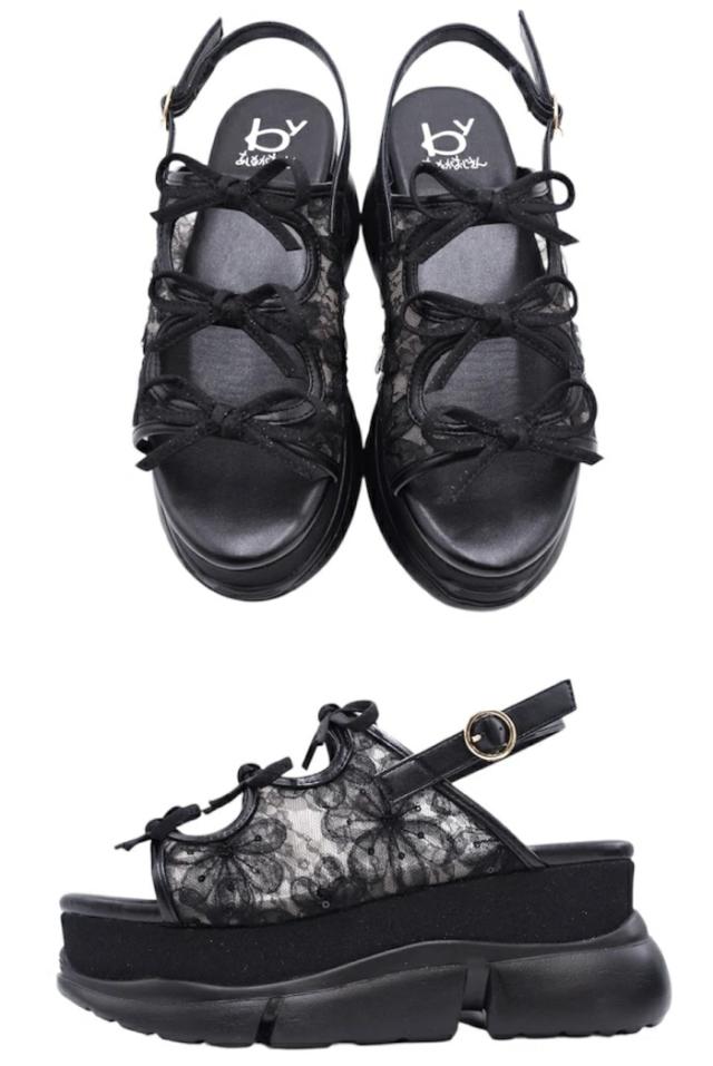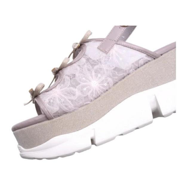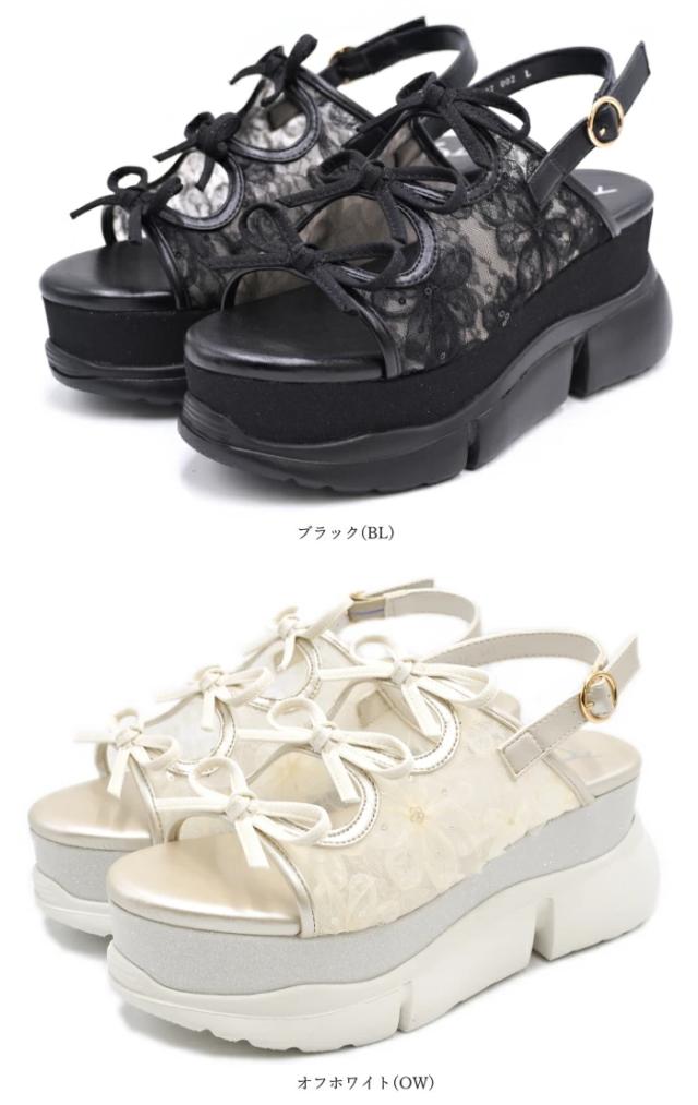 三連リボンがキュートな昨年の人気モデルが素材を変更して再登場!アッパーをシンプルなチュール素材からフラワーレースに変更。ロマンティックなムードをまとい、より可愛く進化しました。また、グリッターソールは上品な微ラメに。さり気ないキラ感が大人っぽムードに。 身長にプラス8cmできる厚底ソールもポイント。別人級にのスタイルを手に入れて。ソールは少し傾斜のあるタイプなので足元がきれい見えし、美脚効果も狙えます。