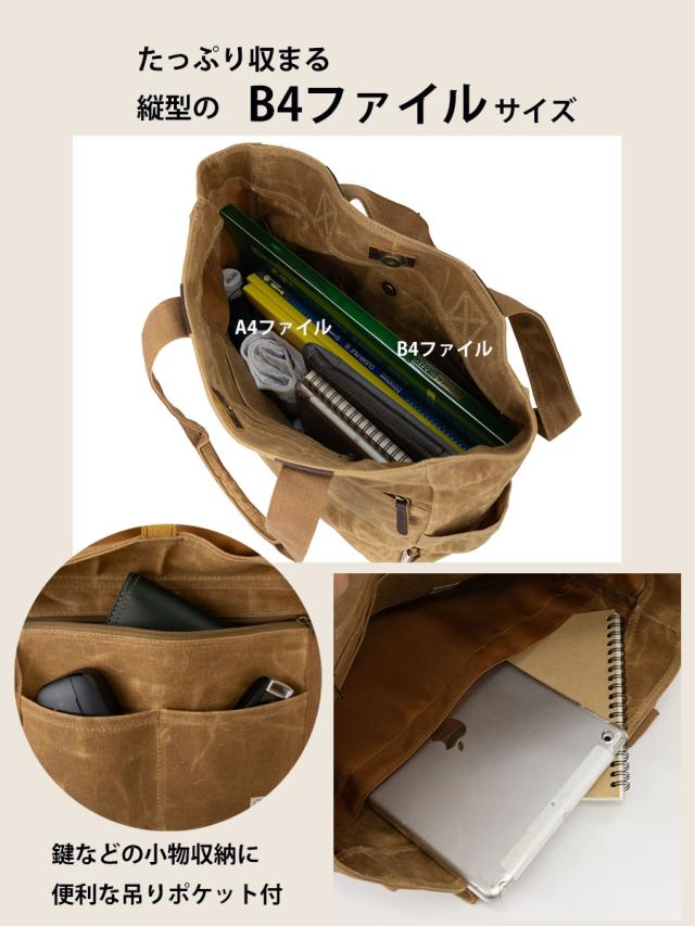 B4ファイルが横向きに収まる大容量トートバッグです。小物を収納できる吊りポケットと書類が入る大き目のポケットがあります。耐久性に優れていることから通学等ハードにお使いいただけます。