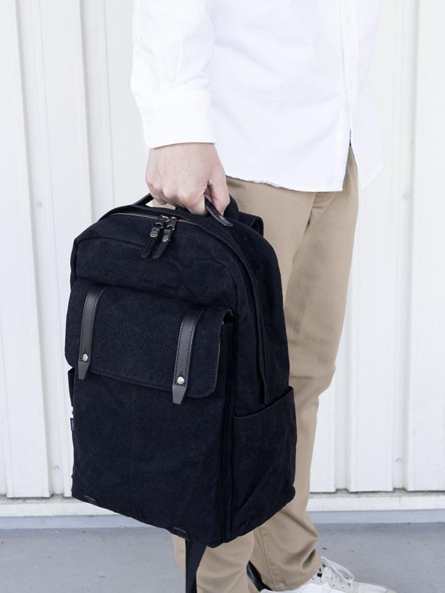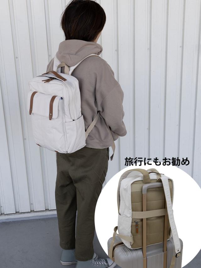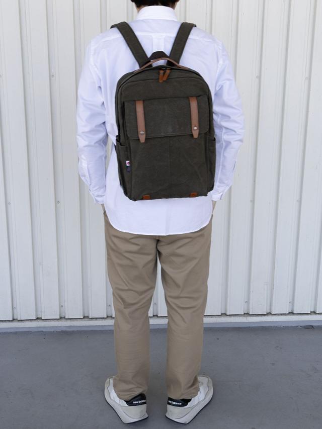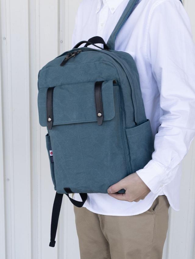 130年以上受け継がれてきた高度な糸撚り技術によって織られた倉敷帆布を、ロウに漬け込み防水にするパラフィン加工を施し、さらに洗いをかけるバイオ加工で仕上げています。味わいがある優しい表情にイタリアンレザーのパーツを組み合わせ。育てる楽しみと撥水の安心感のある家族でシェアしたいリュックです。