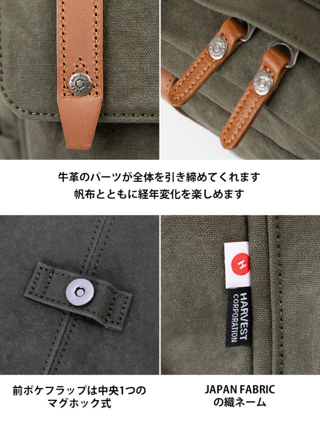 ■130年以上受け継がれてきた高度な糸撚り技術によって織られた倉敷帆布を、ロウに漬け込み防水にするパラフィン加工を施し、さらに洗いをかけるバイオ加工で仕上げています。味わいがある優しい表情にイタリアンレザーのパーツを組み合わせ。育てる楽しみと撥水の安心感のある家族でシェアしたいリュックです。 ■大きすぎず小さすぎずA4ファイルがちょうど収まる見た目も収納力もちょうどいい、オンオフを軽やかにつなぐ日常にジャストフィットするサイズ感。キャリーにセットアップもでき旅行にも便利です。 ■鞄メーカHARVESTの革を主体として素材や仕様にこだわったカジュアルライン”DOUBLES”のプロダクト「JAPAN FABRIC」の人気BQZシリーズです。 |