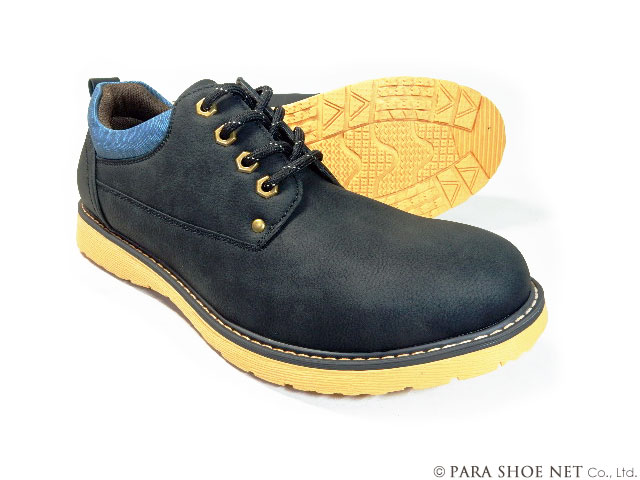 レザー風素材のお洒落なカジュアルシューズ。アッパー素材は雨や汚れに強い合成皮革、ソールは滑りにくい合成ゴムで、4cm防水構造(地面から4cm×4時間防水/※完全防水ではありません。)となっています。裏地はメッシュで足当たりが良く、インソールはやわらかいクッション性に大変優れた低反発素材で、衝撃を吸収し疲れにくい設計です。(インソールは、取り外して洗うことができます。)デザインも、どんな服にも合わせやすいタウンシューズです。