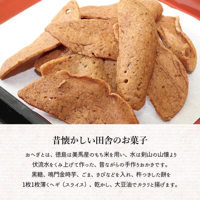 徳島に昔から伝わる郷土菓子「揚げおへぎ」は、昔懐かしい田舎のお菓子です。徳島産のもち米を丁寧につき、黒糖、鳴門金時芋/薩摩芋、ごま、きびなどを入れて1枚1枚薄くへいで乾燥させ、香ばしく揚げました。カリッと軽い食感と、黒糖のやさしい甘み、鳴門金時やごまの風味が、どこか懐かしい味わい。徳島の地元で長くご愛顧いただいている自慢の人気商品です。