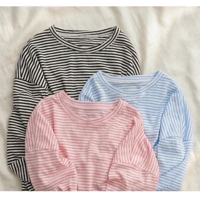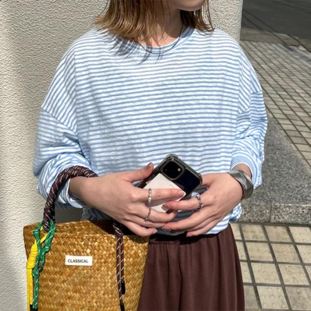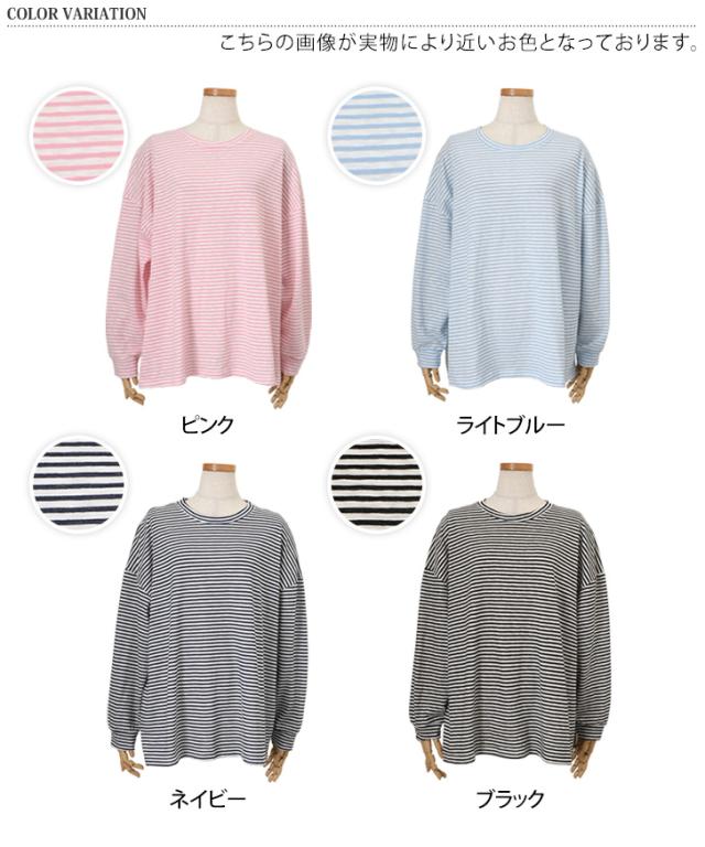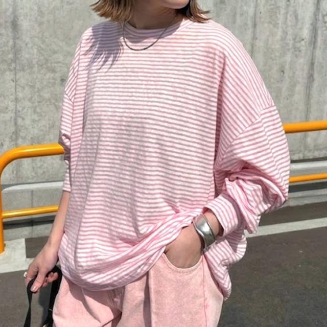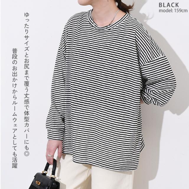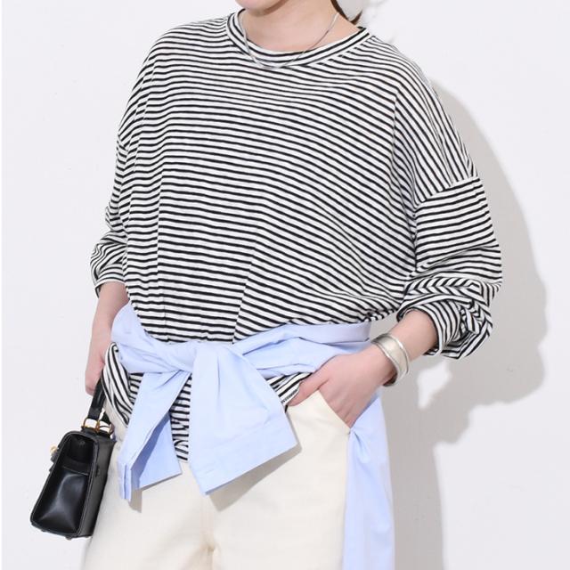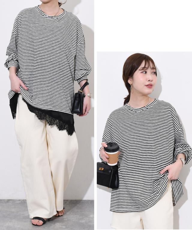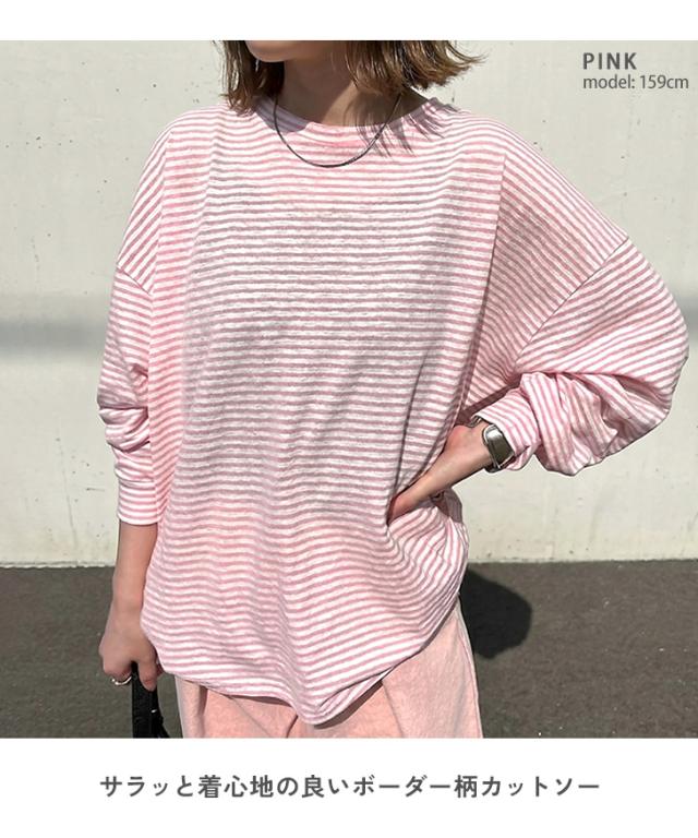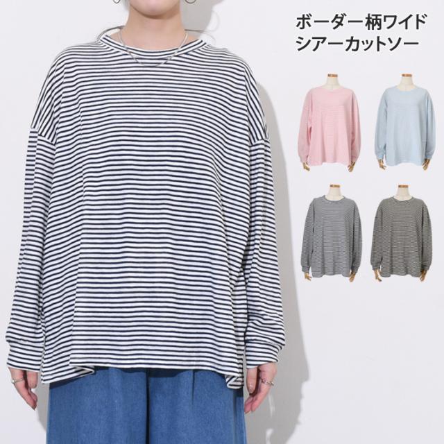 新作 ボーダー柄ラウンドネックスラブワイドシアーカットソー レディース トップス 春 薄手 透け感 Tシャツ ロンT 綿混 ゆったり 大きめ シンプル カジュアル 韓国ファッション おしゃれ デイリー 定番 楽ちん
