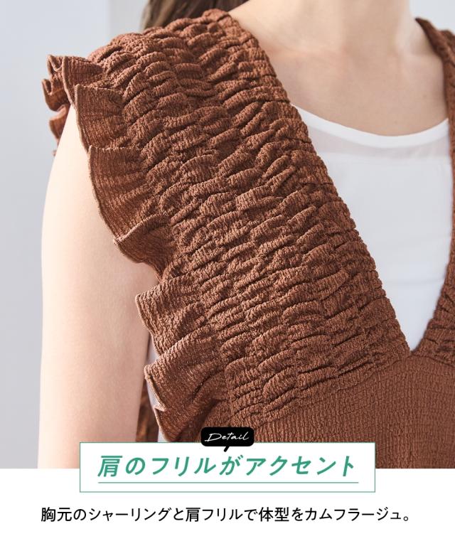 甘すぎない大人のフリル使いが魅力。 深めのVネックで顔周りをスッキリ見せつつ、肩のボリューム感で気になる二の腕もしっかりカバー。 着痩せと「可愛い」を同時に叶える、これ一枚で主役になれる贅沢な一着です。 ■デザイン最大のポイントは肩にあしらわれた立体的なフリルデザイン。 視線を上に集めることでスタイルアップ効果が期待できます。 ゆったりとしたAラインシルエットが体のラインを拾わず、 一日中ストレスフリーに過ごせる設計です。■素材表面に表情のあるシボ感のある素材を採用。肌離れが良く、 汗ばむ季節でもベタつきにくいのが嬉しいポイントです。 シワになりにくいのでお手入れも簡単。 デイリー使いはもちろん、長時間の移動を伴う旅行にも最適です。 ■おススメコーディネート シンプルな白Tシャツやタンクトップを合わせるだけで、洗練された大人カジュアルが完成。 シアー素材のブラウスをインすれば、お出かけやランチにもぴったりな綺麗めコーデに。 足元はサンダルで抜け感を出すのが今季流。