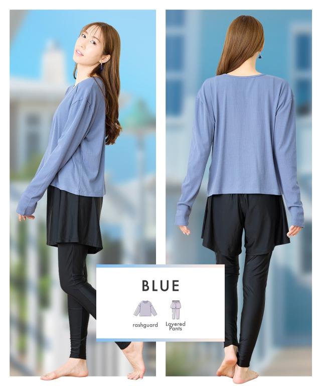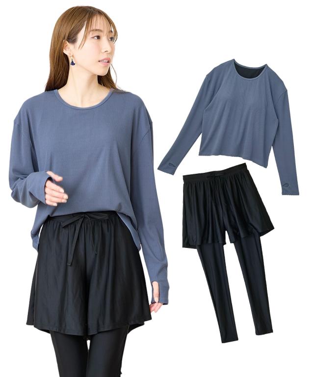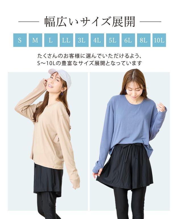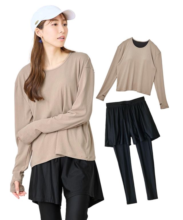 「水着を着る」抵抗感をゼロに。洋服見えするリブ素材と、鉄壁の体型カバー力を備えた水陸両用2点セット。 海やプールはもちろん、そのまま街歩きやBBQも楽しめる、大人世代のための「隠せる」セットアップです。 ■デザイン トレンド感のあるリブ素材を採用し、ラッシュガード特有のテカリを抑えたマットで上品なルックスに仕上げました。 トップスはゆとりのあるドロップショルダーで二の腕をカバーし、ボトムスはショートパンツと レギンスを重ね着したような「フェイクレイヤード」デザイン。 気になるヒップラインや太ももをふんわり隠しながら、脚をすっきりと見せてくれます。 ■素材 トップスは肌あたりの柔らかいレーヨン・ポリウレタン混。 しっとりとした質感で普段着のように心地よく着用いただけます。 レギンス付きパンツは、水中でも動きやすく速乾性に優れたポリエステル・ポリウレタンを使用。 どちらもストレッチ性に優れ、アクティブなシーンでもストレスフリーです。 ■機能 ・1枚で完結: トップスはインナー(ブラカップ)一体型。 取り外し可能なレモンパッド付きで、これ1枚でパッと着替えが完了します。 ・UV対策: 指穴(サムホール)付きの袖で、手の甲までしっか