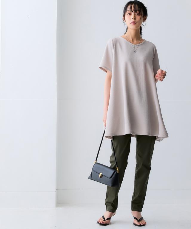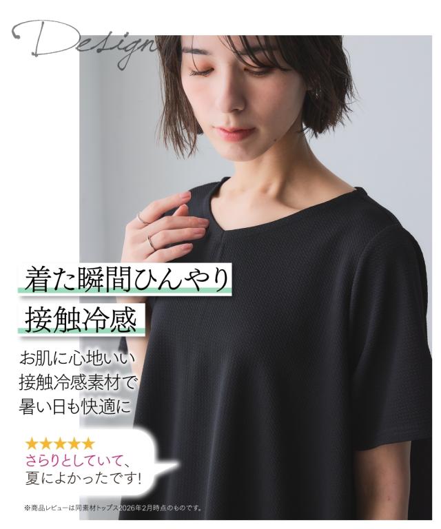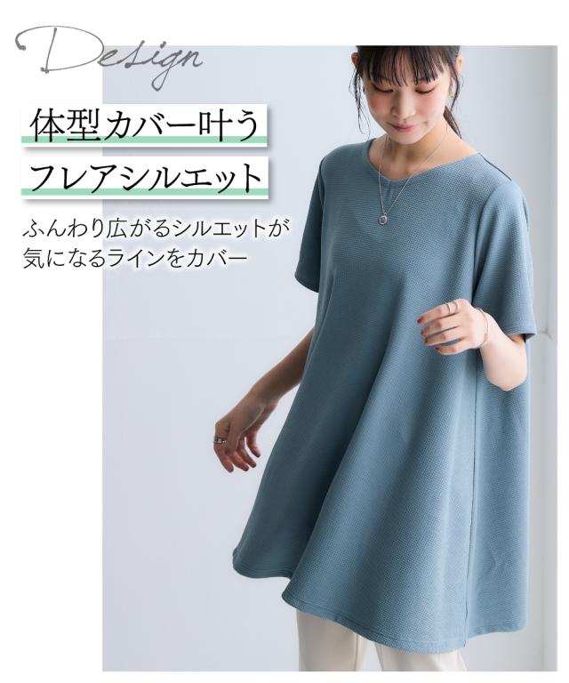 毎日着たくなる、涼しい一着。【シリーズ累計枚数35,000枚を誇るふくれジャガードシリーズに新型登場 夏に嬉しい機能性が増えてパワーアップ 】着るだけで、すっきり涼やか。フレアシルエットふんわり体型をカバーしてれます。 ■デザイン Vネックで顔まわりをすっきり演出。ふんわりシルエットで気になる下半身を安心カバー。袖丈もしっかりあるので気になる二の腕も隠れて安心、全身すっぽり隠れるデザインで、動きやすく軽やかに。 ■素材 凹凸感のある素材で体型を拾いにくく、自然に美しいシルエット。立体感のある風合いが、着るだけで高見えを叶えます。涼やかな素材感で夏も快適。ポリエステル素材だから洗濯後もすぐ乾き、アイロンいらずでお手入れ簡単。しわになりにくく、旅行やお出かけにも便利です。紫外線カット機能付きで、外出時も安心。 ■おすすめのスタイリング いつものボトムと合わせるだけで簡単にコーディネートがきまる時短アイテム。丈が長すぎないので太目のパンツと合わせてもずるゆるコーデでかわいいのでお勧め。五分袖なので涼しい時は中に長袖を合わせても素敵なのでお勧めです。