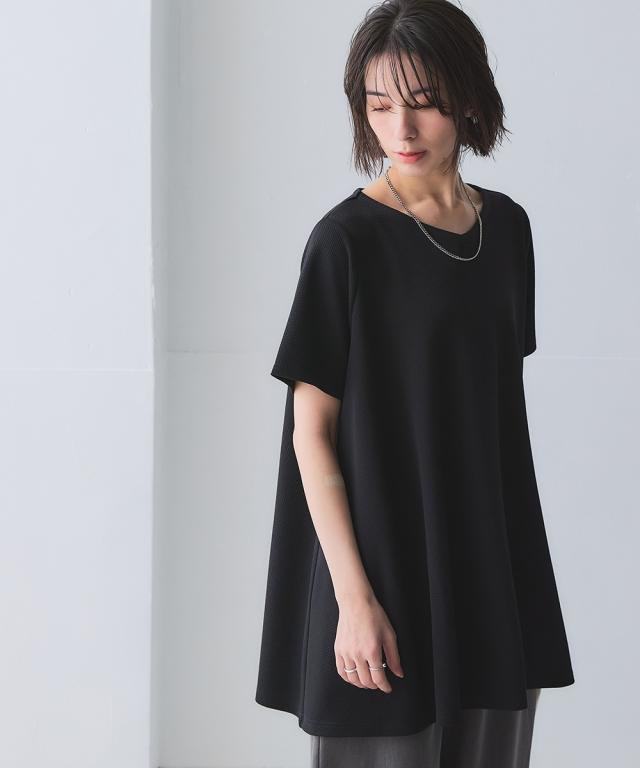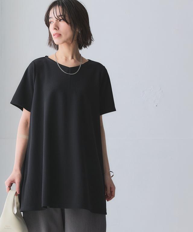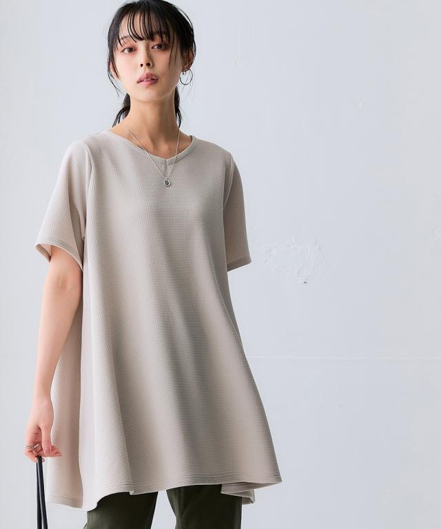 ふくれジャガードカットソー5分袖Vネックフレアチュニック(イージーケア・UVカット・接触冷感)