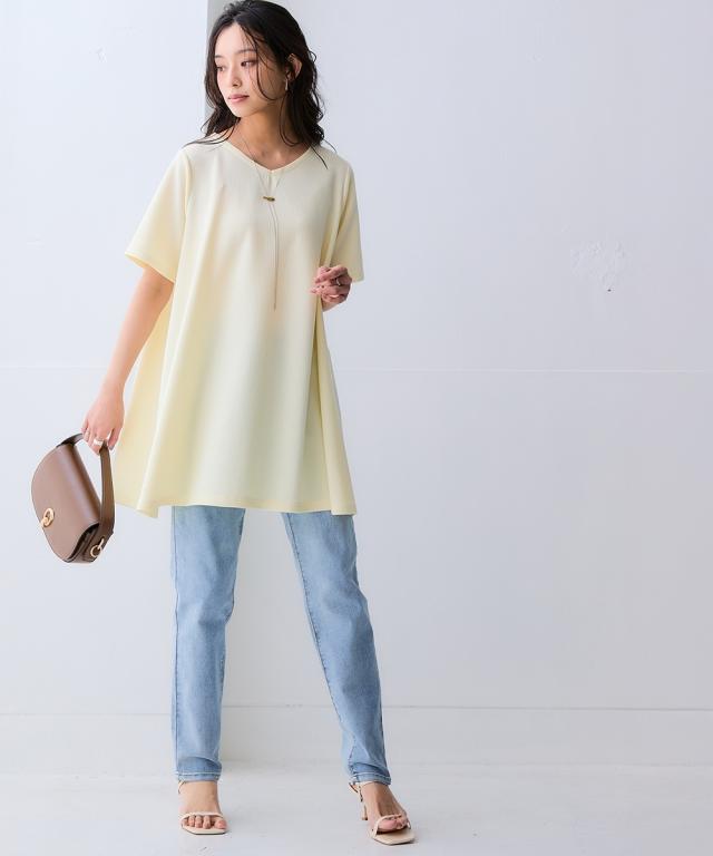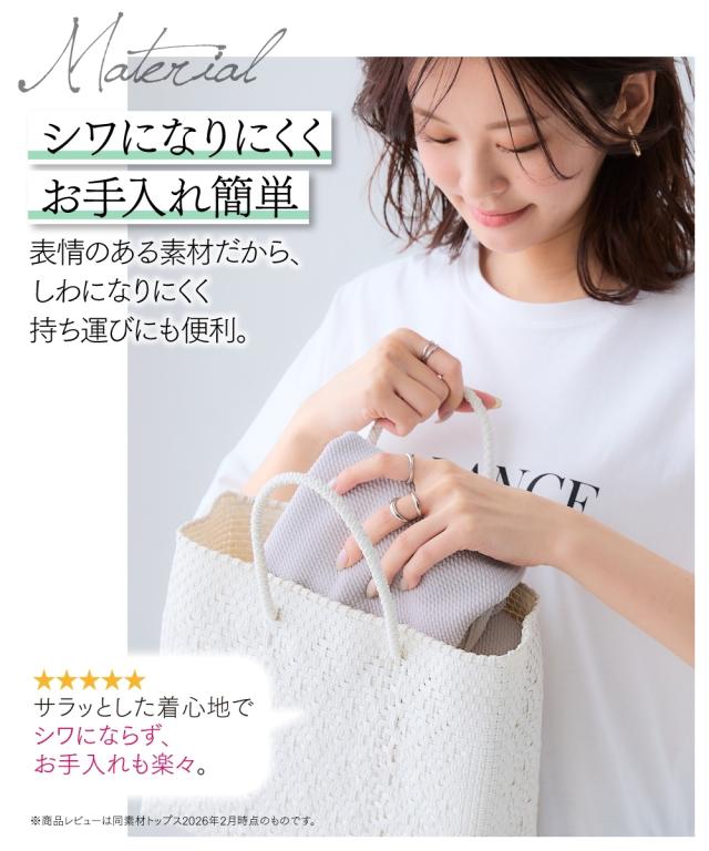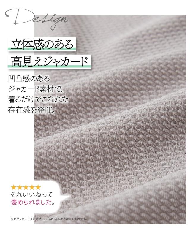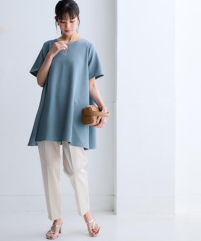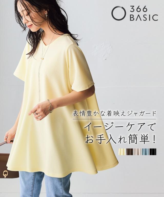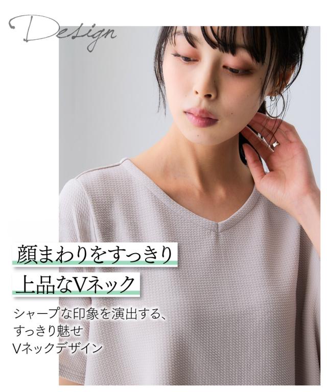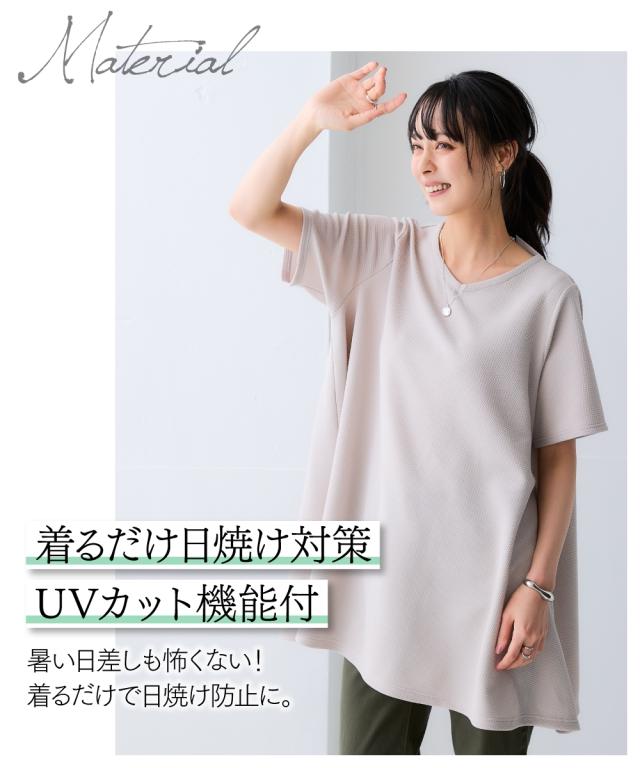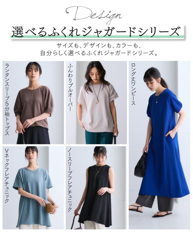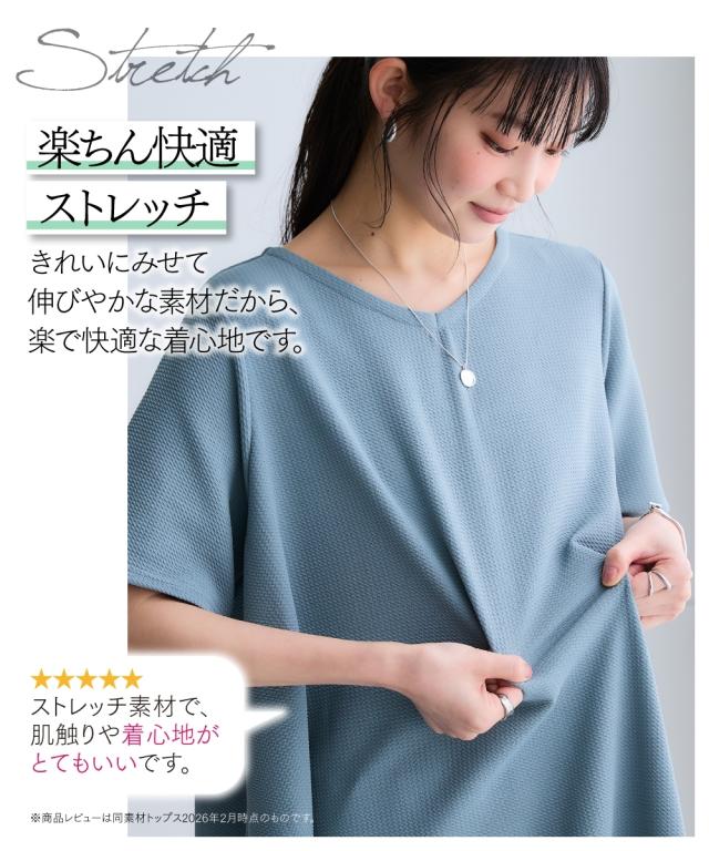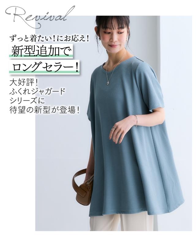 毎日着たくなる、涼しい一着。【シリーズ累計枚数35,000枚を誇るふくれジャガードシリーズに新型登場 夏に嬉しい機能性が増えてパワーアップ 】着るだけで、すっきり涼やか。フレアシルエットふんわり体型をカバーしてれます。 ■デザイン Vネックで顔まわりをすっきり演出。ふんわりシルエットで気になる下半身を安心カバー。袖丈もしっかりあるので気になる二の腕も隠れて安心、全身すっぽり隠れるデザインで、動きやすく軽やかに。 ■素材 凹凸感のある素材で体型を拾いにくく、自然に美しいシルエット。立体感のある風合いが、着るだけで高見えを叶えます。涼やかな素材感で夏も快適。ポリエステル素材だから洗濯後もすぐ乾き、アイロンいらずでお手入れ簡単。しわになりにくく、旅行やお出かけにも便利です。紫外線カット機能付きで、外出時も安心。 ■おすすめのスタイリング いつものボトムと合わせるだけで簡単にコーディネートがきまる時短アイテム。丈が長すぎないので太目のパンツと合わせてもずるゆるコーデでかわいいのでお勧め。五分袖なので涼しい時は中に長袖を合わせても素敵なのでお勧めです。