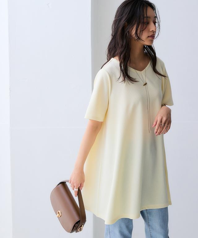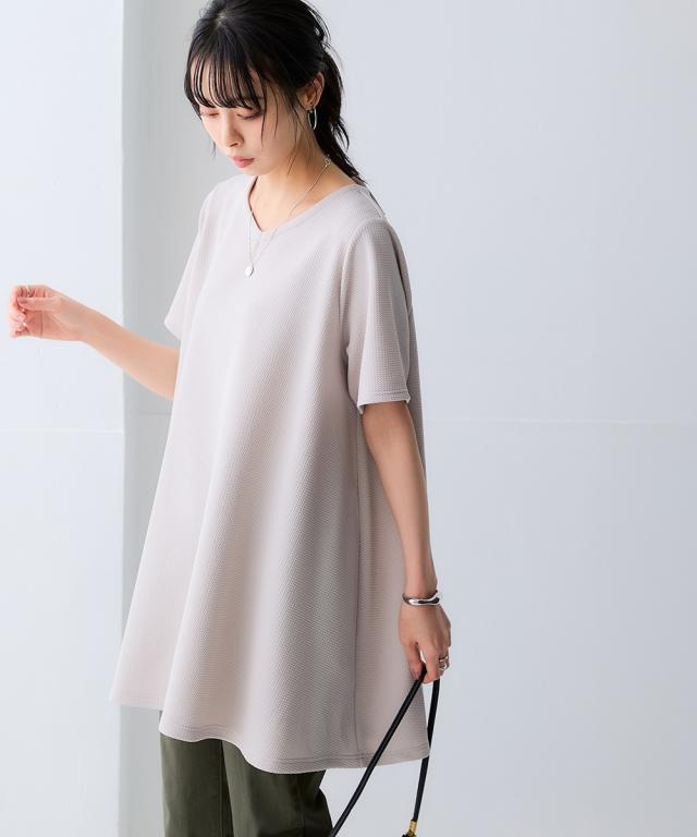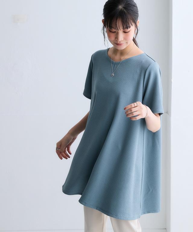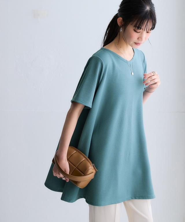 ふくれジャガードカットソー5分袖Vネックフレアチュニック(イージーケア・UVカット・接触冷感)
