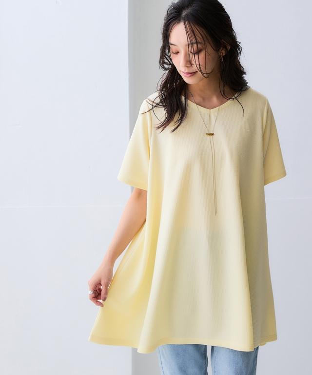 ふくれジャガードカットソー5分袖Vネックフレアチュニック(イージーケア・UVカット・接触冷感)