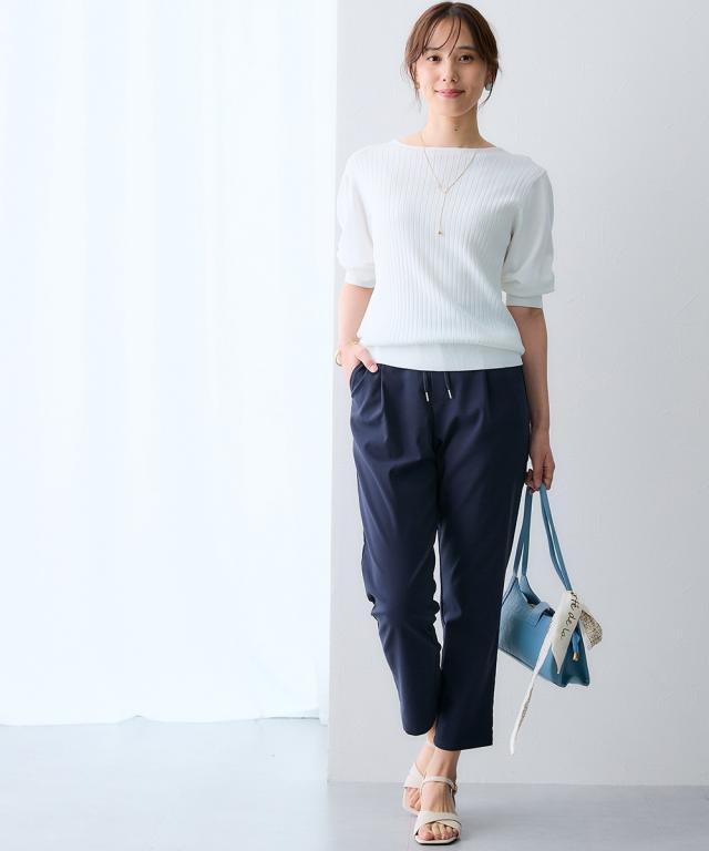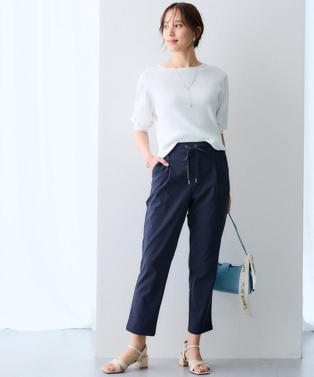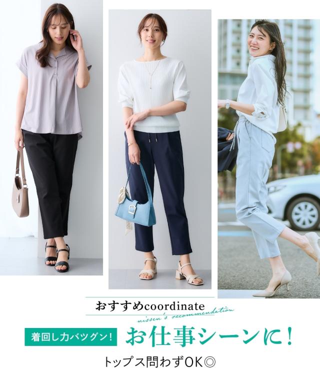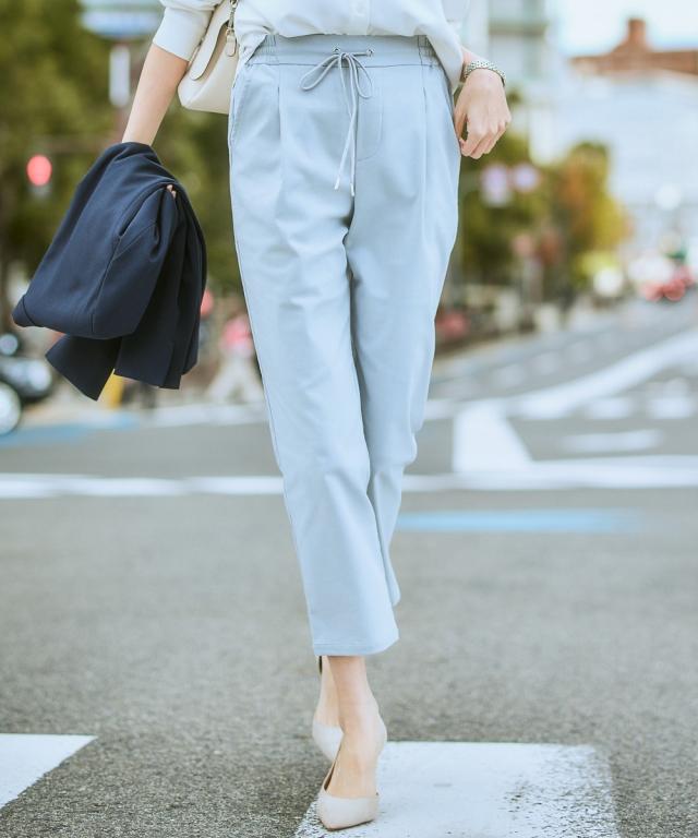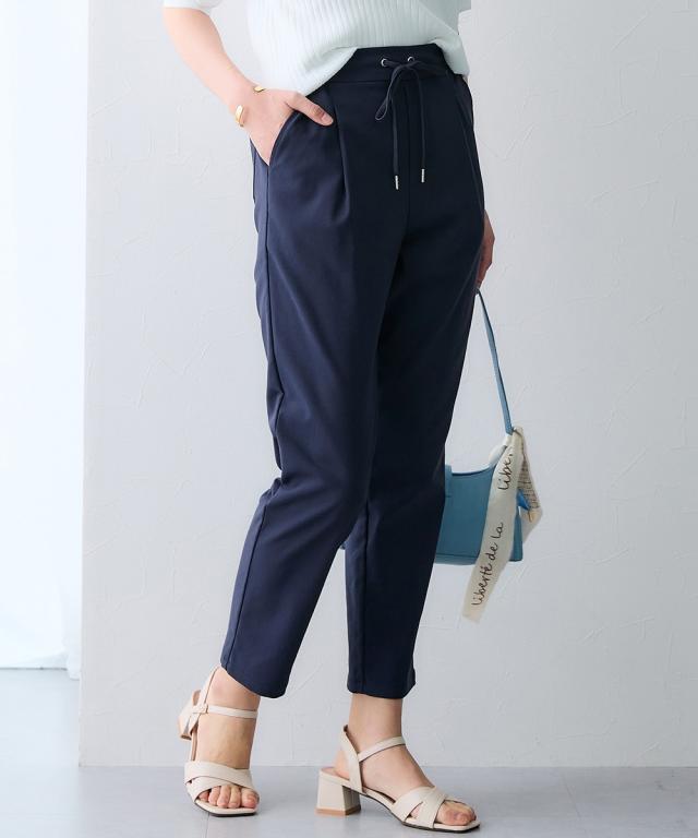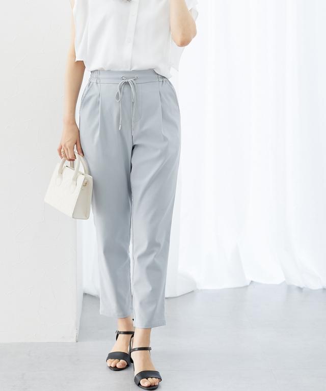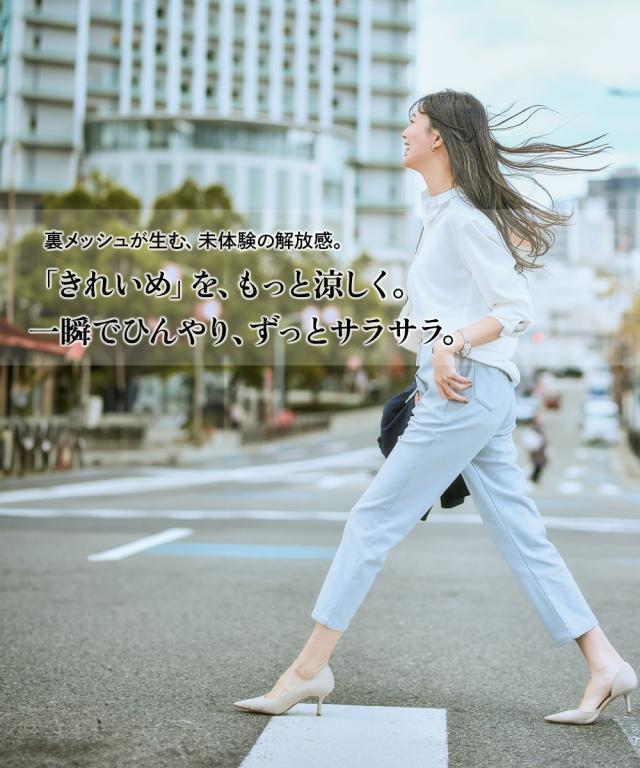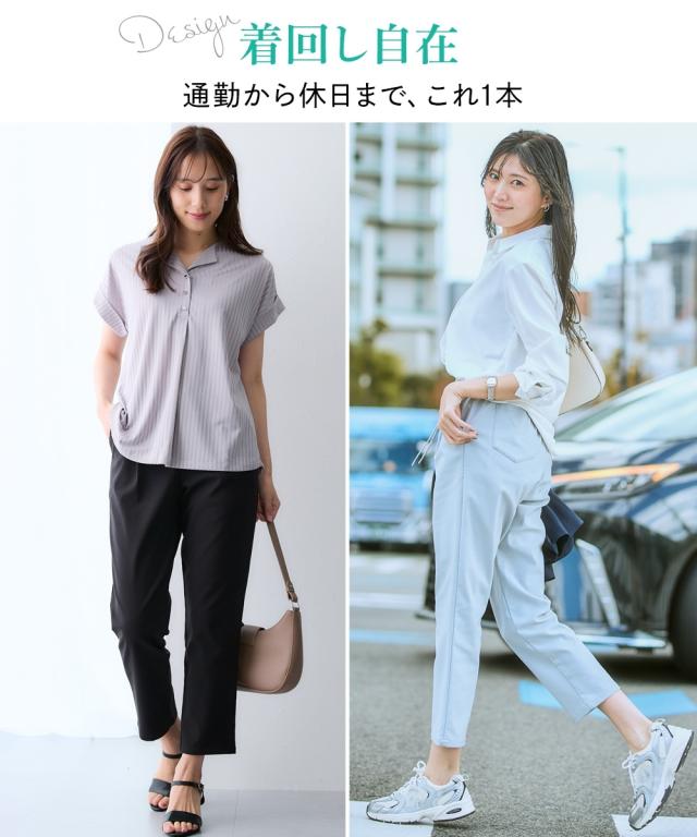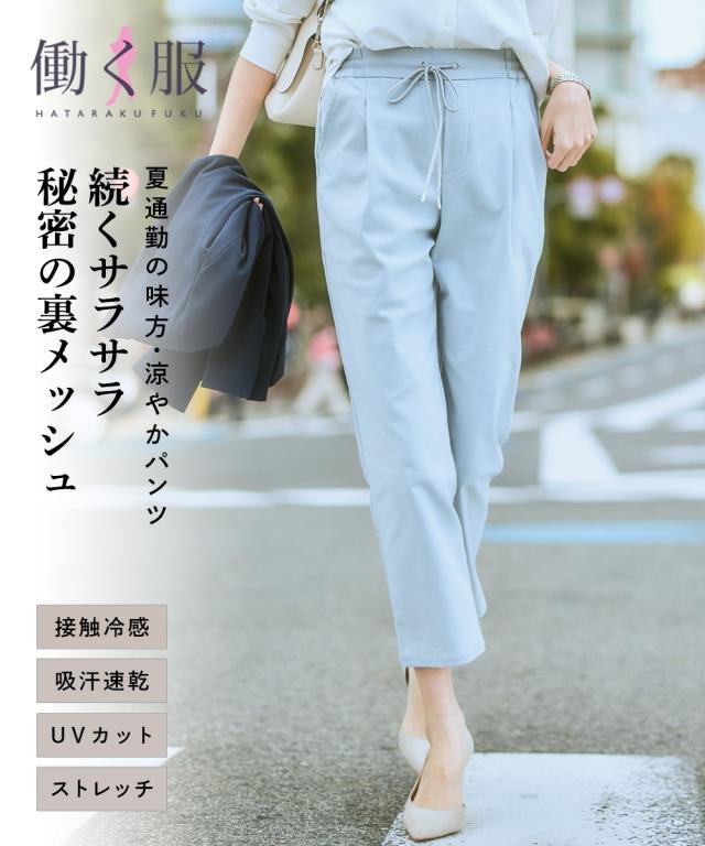 夏通勤の味方。涼やかさが続くサラサラ「秘密の裏メッシュ」パンツ ■デザイン きちんと見えするのに驚くほど快適。シルエットの美しさとリラックス感を両立させたデザインです。 テーパードシルエット: 足元に向かって細くなるラインが、脚長効果とすっきりとした印象を与えます。 ドロストウエスト: ウエストは調整可能な紐(ドロスト)仕様。長時間のデスクワークでもお腹周りが苦しくなりにくいのが魅力です。 センタータック: 腰回りにゆとりを持たせるタック入りで、体型カバーをしつつ上品な立体感を演出します。 アンクル丈: 足首がのぞく丈感で、パンプスとも相性が良く、見た目にも軽やかで涼しげです。 ■素材 「裏メッシュ」構造により、汗をかく季節でも肌離れが良く、一日中サラサラな着心地をキープします。 接触冷感: 穿いた瞬間にひんやりと感じる冷感素材で、真夏の外回りや通勤をサポートします。 吸汗速乾: 汗を素早く吸収して乾かすため、ベタつきを抑え、不快感を軽減します。 ストレッチ: 動きに合わせてしなやかに伸びるため、アクティブなビジネスシーンでもストレスフリーです。 UVカット: 足元まで降り注ぐ紫外線をブロックし、日焼け対策も万全です。 ■スタイ