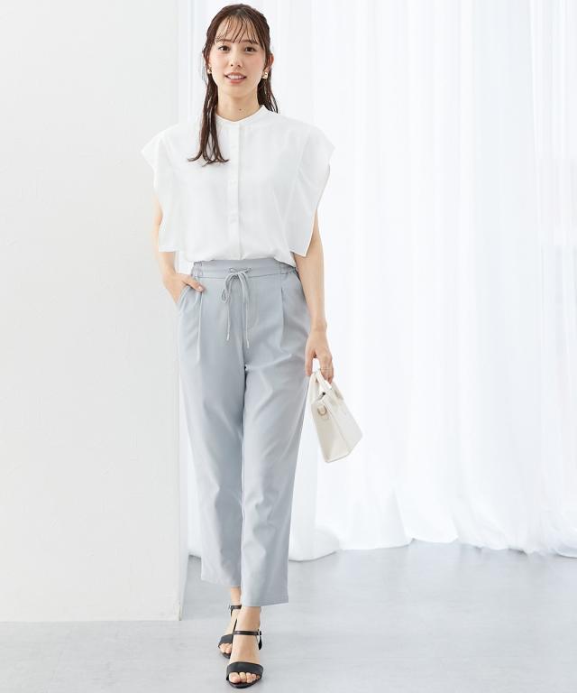 夏通勤の味方。涼やかさが続くサラサラ「秘密の裏メッシュ」パンツ ■デザイン きちんと見えするのに驚くほど快適。シルエットの美しさとリラックス感を両立させたデザインです。 テーパードシルエット: 足元に向かって細くなるラインが、脚長効果とすっきりとした印象を与えます。 ドロストウエスト: ウエストは調整可能な紐(ドロスト)仕様。長時間のデスクワークでもお腹周りが苦しくなりにくいのが魅力です。 センタータック: 腰回りにゆとりを持たせるタック入りで、体型カバーをしつつ上品な立体感を演出します。 アンクル丈: 足首がのぞく丈感で、パンプスとも相性が良く、見た目にも軽やかで涼しげです。 ■素材 「裏メッシュ」構造により、汗をかく季節でも肌離れが良く、一日中サラサラな着心地をキープします。 接触冷感: 穿いた瞬間にひんやりと感じる冷感素材で、真夏の外回りや通勤をサポートします。 吸汗速乾: 汗を素早く吸収して乾かすため、ベタつきを抑え、不快感を軽減します。 ストレッチ: 動きに合わせてしなやかに伸びるため、アクティブなビジネスシーンでもストレスフリーです。 UVカット: 足元まで降り注ぐ紫外線をブロックし、日焼け対策も万全です。 ■スタイ