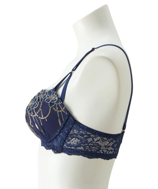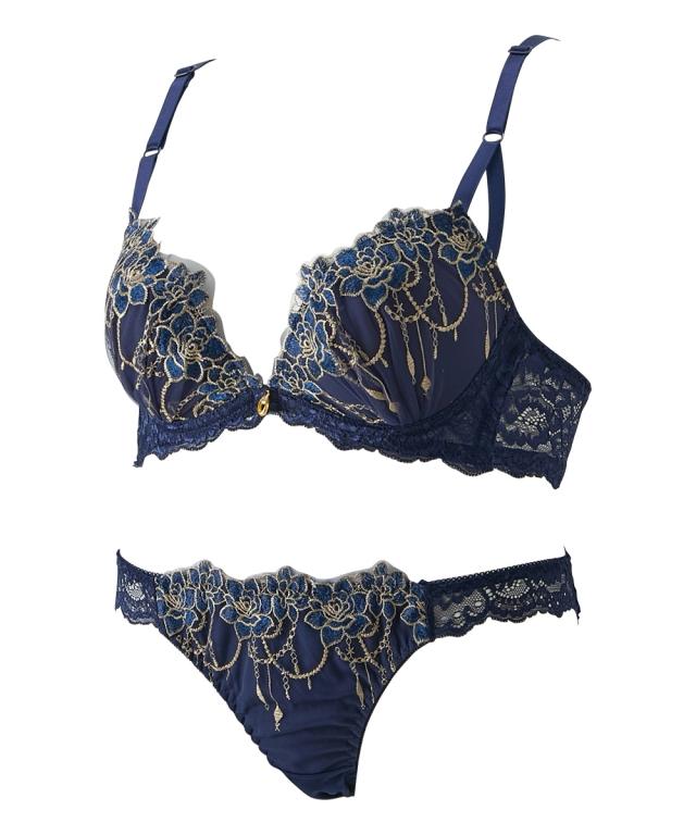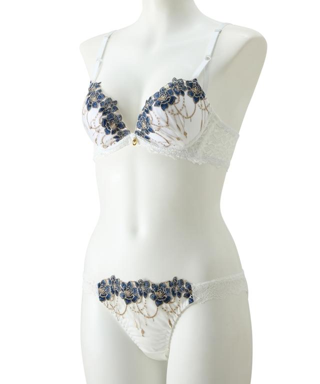 エレガントなブラ&ショーツが登場! ゴージャス感のあるゴールド刺繍と華やかローズ刺繍が目を惹くデザイン! 胸元のチャームで上品さをプラス 脇高設計で背中からしっかり寄せこみ、美谷間&美シルエット!