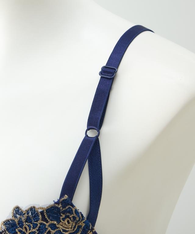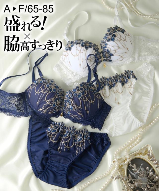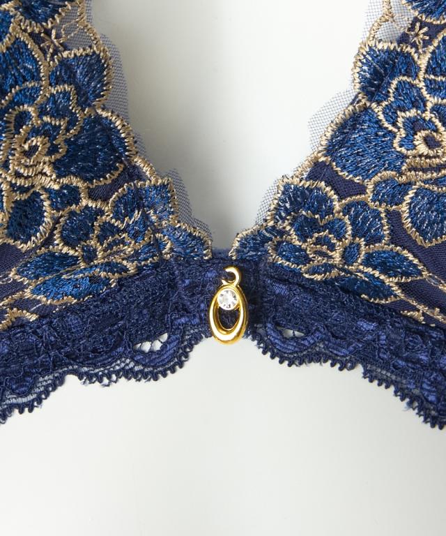 エレガントなブラ&ショーツが登場! ゴージャス感のあるゴールド刺繍と華やかローズ刺繍が目を惹くデザイン! 胸元のチャームで上品さをプラス 脇高設計で背中からしっかり寄せこみ、美谷間&美シルエット!