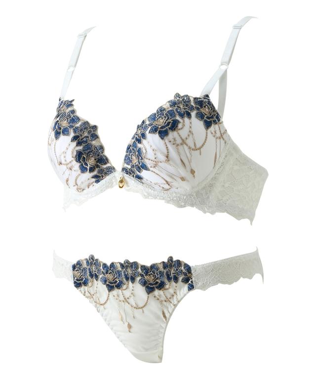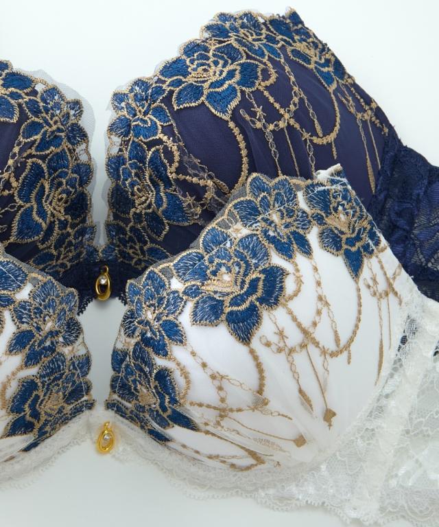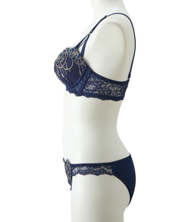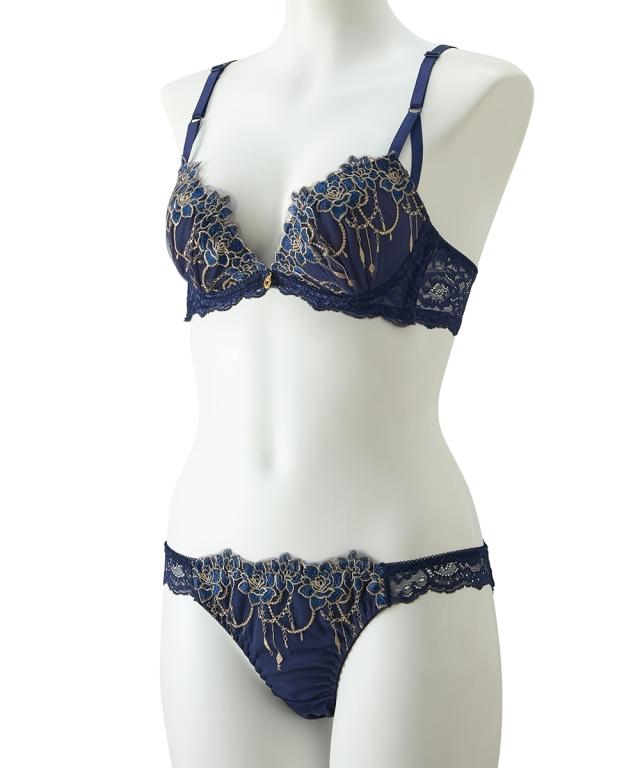 エレガントなブラ&ショーツが登場! ゴージャス感のあるゴールド刺繍と華やかローズ刺繍が目を惹くデザイン! 胸元のチャームで上品さをプラス 脇高設計で背中からしっかり寄せこみ、美谷間&美シルエット!