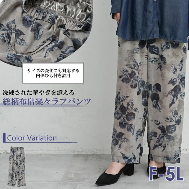 大きいサイズ レディース 総柄ラフパンツ メール便送料無料 ロング丈 ウエストゴム リーフ柄 透け感 ボトムス F/LL/3L/4L/5L ゆったりサイズ ぽっちゃり女子 プラスサイズ