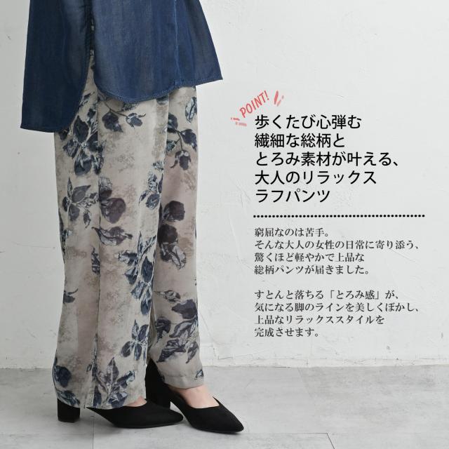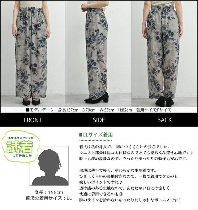 【JANJAM2026春新作】パンツ ボトムス ロングパンツ ワイドパンツ ルーズパンツ イージーパンツ リラックスパンツ ラフパンツ 総柄パンツ リーフ柄パンツ 花柄パンツ ウエストゴム 総ゴム ウエスト紐 ハイウエスト 花柄 リーフ柄 ボタニカル柄 植物パターン 総柄プリント ロング丈 マキシ丈 10分丈 12分丈 十分丈 サイドポケット 春服 夏服 春物 夏物 春パンツ 夏パンツ 春夏パンツ 春夏ファッション 股上深め 股上66cm 裏地付き 裏地あり 涼感 ゆったり 長ズボン 体型カバー 下半身カバー 細見え 美脚 美脚効果 楽に穿ける 動きやすい 透けない カジュアルパンツ デイリーパンツ おしゃれパンツ ラフ 快適 大人 カジュアル ナチュラル 大人カジュアル 大人かわいい おしゃれ きれいめ かわいい かっこいい 着こなし 着回し コーデ 定番 普段着 お出掛け リゾート トレンド 人気 春コーデ 夏コーデ 大きめ ぽっちゃり プラスサイズ JANJAM ジャンジャン ジャンジャム 女性 婦人用 婦人 ミセス 30代 40代 50代 40代女性ファッション 50代女性 50代ファッション レディースファッション 2026 春新作 春 夏 灰色 グレー ブルー F LL 3L 4L 5L 9号 13号 15号 17号 19号 bw-ss-bt1038