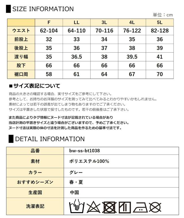 5L:ウエスト82-128 前股上36 後股上39 渡り幅41 股下66 裾口周70