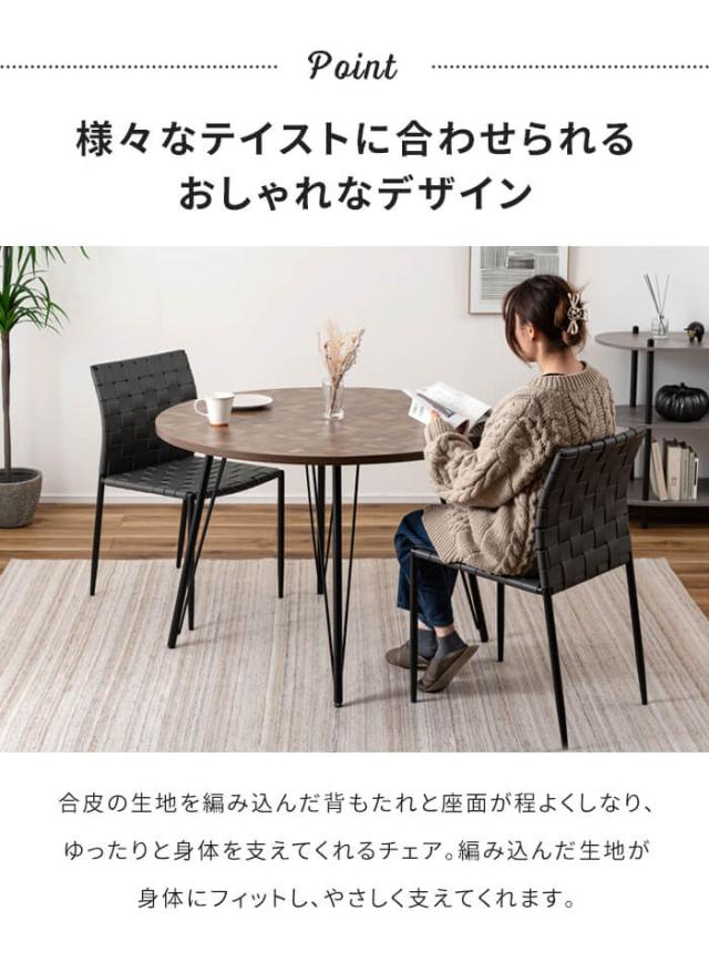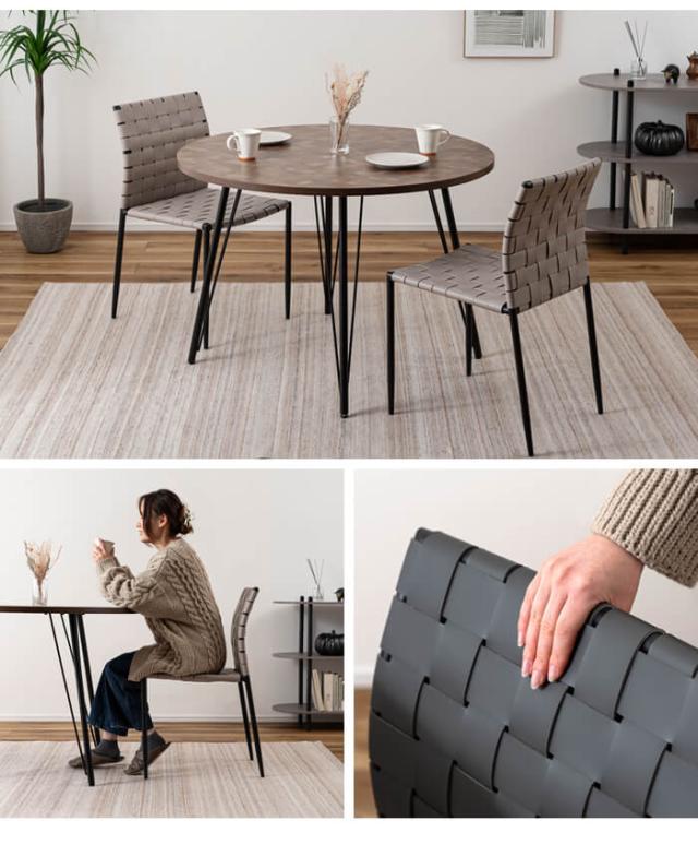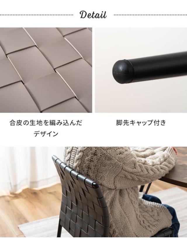 | 合皮の生地を編み込んだ背もたれと座面が程よくしなり、ゆったりと身体を支えてくれるチェア。 編み込んだ生地が身体にフィットし、やさしく支えてくれます。 脚先には丸いキャップが付いているので床への傷を軽減。 ダイニングチェアとしても活躍。 |