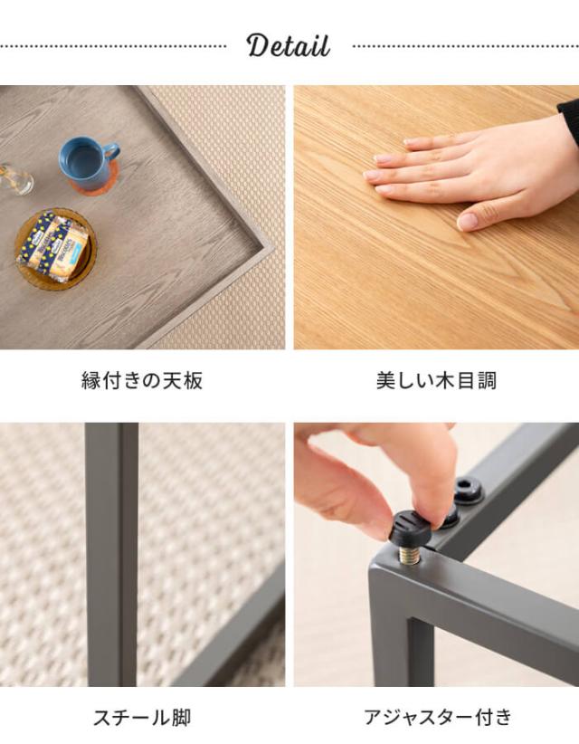 | 天然木アッシュ材の木目が目を惹くリビングテーブル。 細身のスチールフレームでお部屋に圧迫感を与えにくくすっきり。 天板にはアッシュ剤を使用した化粧繊維板を採用し、プリントでは味わえない天然木ならではの美しい木目と自然な風合いをお楽しみいただけます。 フチを少し高くしてトレーのような形状にすることで、上に置いたものが落ちにくい仕様になっています。 幅60×奥行60cmで一人暮らしの方にもおすすめなコンパクトサイズ。 脚にアジャスターがついているので高さを微調整でき、ガタツキを防ぎます。 |
