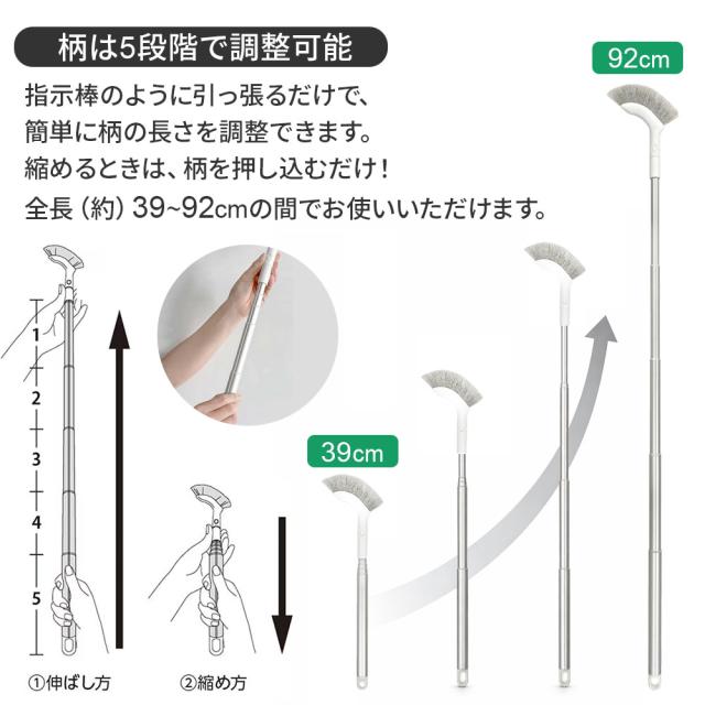 指示棒のように引っ張るだけで、簡単に柄の長さを調節できるブラシ。