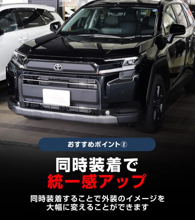 新型RAV4 60系 Adventure〈2025年12月フルモデルチェンジ後〉専用設計の、フロントフェイスをトータルでドレスアップできる、フロントグリルガーニッシュとロアグリルガーニッシュのお得なセットです。