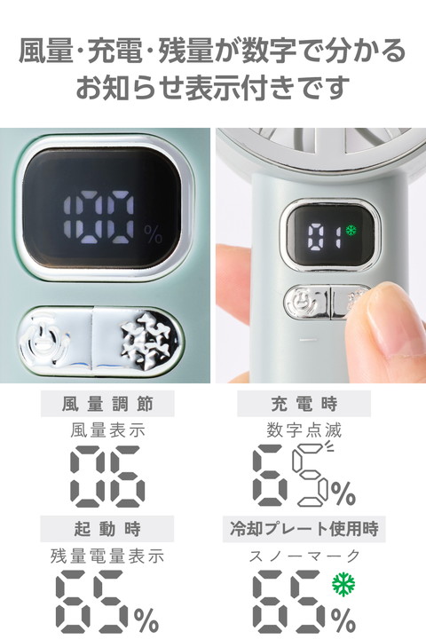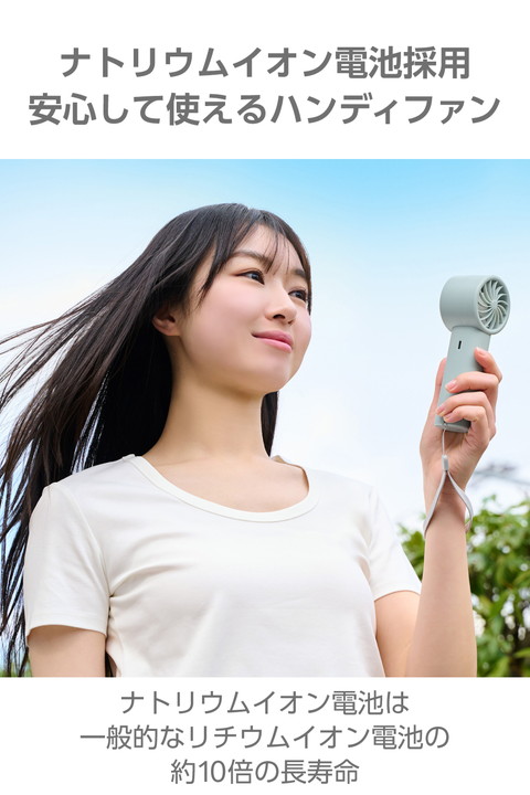 地球にも人にも優しいナトリウムイオン電池を採用。長寿命で、安心して使える冷却プレート付きハンディファンです。ファンの風とプレートの冷たさで、いつでもどこでも瞬間クールダウン。充電・残量がひと目で分かるお知らせ表示付きなので、外出前にチェックできて便利です。