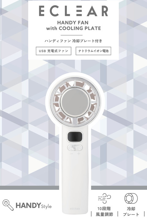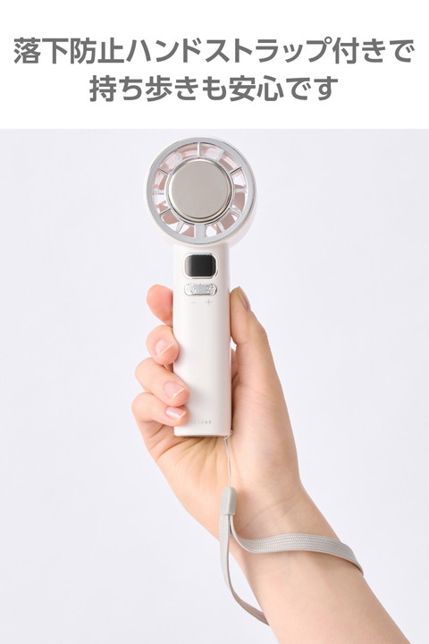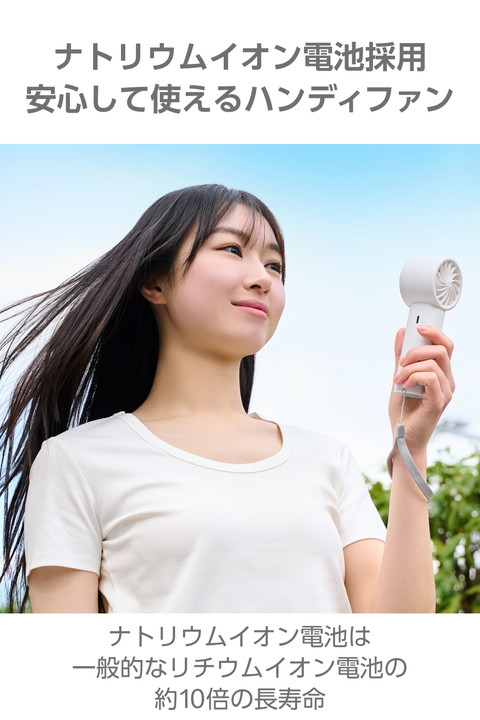 地球にも人にも優しいナトリウムイオン電池を採用。長寿命で、安心して使える冷却プレート付きハンディファンです。ファンの風とプレートの冷たさで、いつでもどこでも瞬間クールダウン。充電・残量がひと目で分かるお知らせ表示付きなので、外出前にチェックできて便利です。![]() ■日常の持ち歩きやさまざまな使用環境を想定し、電源設計にこだわりました。安全性の高い電池を搭載し、安心して使えるハンディファンです。 ■ナトリウムイオン電池のサイクル寿命は約5,000回で、一般的なリチウムイオン電池に対して約10倍の長寿命。買い替えの手間が減って、暑い夏の相棒として長く活躍します。 ■ナトリウムイオン電池はコバルト・リチウムなどを使用しないため、環境への負荷が少なく、安定した供給を実現。持続可能な資源利用に貢献し、地球にも人にも優しい電池を搭載しています。 ■フロント部分の冷却プレートは、冷却のペルチェ素子を採用。肌で直接涼しさを感じられ、ファンの風と合わせて一気にクールダウンできます。 ■動作中に右ボタンを長押しすると、冷却プレートをON/OFFできます。冷却プレート使用時は、スノーマークが点灯します。 ■※充電中は使用できません。 ■うっかり手を放しても安心な落下防止のハンドストラップ付き。手首にかけて使えて、バッグからの出し入れもしやすいので、外出時の持ち歩きに活躍します。 ■USB Type-C(TM)ポートから充電が可能。付属のケーブルで、AC充電器やノートパソコンから充電できます。 ■※AC充電器は付属していません。別途ご購入またはご用意ください。 ■風量・充電・残量が数字でひと目で分かるお知らせ表示付き。外出前に充電残量をチェックできるので、安心して持ち歩けます。 ■好みに合わせて10段階の風量調節ができます。細かく調節できるので、ちょうどいい風量を選べます。 ■髪の毛の巻き込みや異物の挟み込みを検知するとファンが停止する「自動安全OFF設計」です。 ■過充電・過放電を防ぐ安心の回路設計です。 ■※USB Type-C and USB-C are trademarks of USB Implementers Forum. ![]() ■電源:充電式ナトリウムイオン電池 ■連続動作時間:冷却プレートOFF時:約2時間〜約4.5時間(満充電時)、冷却プレートON時:約1時間(満充電時) ※風量の強弱によって変化します。 ■充電時間:約2時間 ■定格入力:5V/2A ※AC充電器は出力2A以上のものをご使用ください。 ■消費電力:約10W ■バッテリー容量:3050mAh ■風量調節:10段階 ■外形寸法:幅約65mm×奥行約53mm×高さ約167mm ■質量:約195g ※本体のみ ■カラー:ホワイト ■使用温度範囲:放電時:0℃〜50℃、充電時:15℃〜40℃ ■付属品:ハンドストラップ×1本、給電用USB-A - USB Type-C(TM)ケーブル×1本(約45cm ※コネクター部含まず) ■保証期間:1年間 |