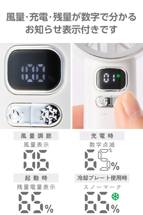 地球にも人にも優しいナトリウムイオン電池を採用。長寿命で、安心して使える冷却プレート付きハンディファンです。ファンの風とプレートの冷たさで、いつでもどこでも瞬間クールダウン。充電・残量がひと目で分かるお知らせ表示付きなので、外出前にチェックできて便利です。