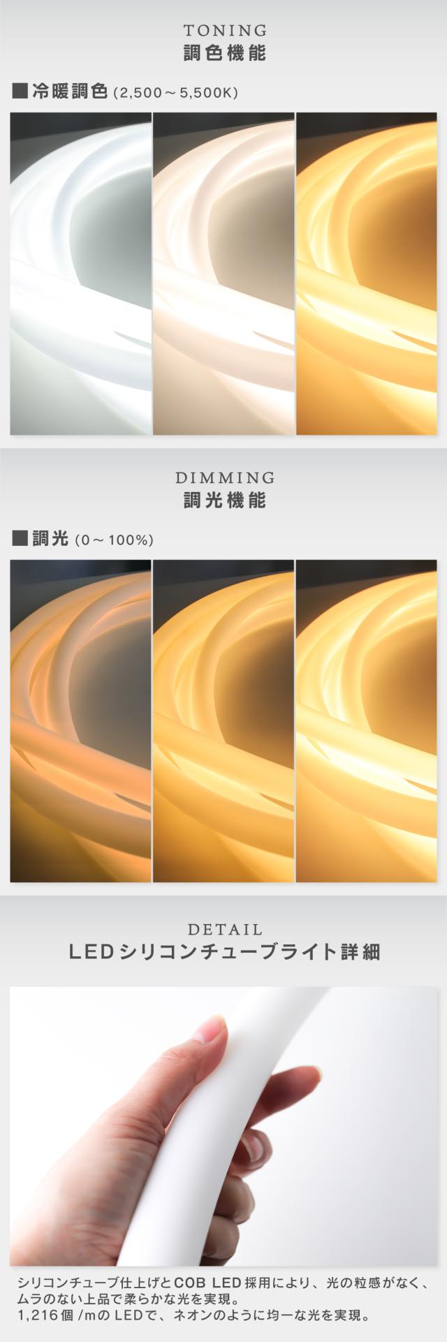 さらにシリコンカバーを通してやわらかく光を拡散し、ネオンライトのようにムラの少ない均一な明かりを灯します。
