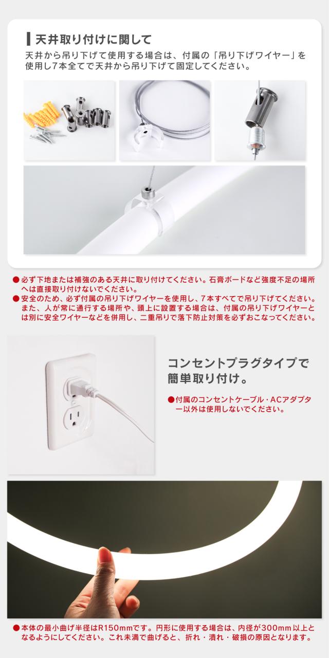 | 使用上の注意 | ●本製品は重量があります。天井や取付面は、製品の重量および使用環境に十分耐えられる構造であることを確認してください。取り付け場所の材質によっては、付属品または市販の適切なアンカーをご使用ください。 ●人が常に通行する場所や、頭上に設置する場合は、付属品とは別に安全ワイヤーを使用し、二重吊りにするなど落下防止対策を必ずおこなってください。 ●リモコンで消灯する際、若干のタイムラグが生じることがありますが、仕様上であり、不具合ではありません。 ●使用時には必ず付属のACアダプターをご使用ください。 ●使用中は本体やACアダプターが熱くなる場合があります。放熱されやすく空気の流れがよい場所に設置してください。 ●こちらの製品はアプリや音声では操作できません。付属の専用リモコンで操作をおこなってください。 ●電圧変動によりチラつくことがありますが故障ではありません。 ●LED素子には光色、明るさにバラつきがあるため、同じ商品であっても色や明るさが異なる場合があります。 その他取扱説明書をよくお読みの上ご使用ください。 |