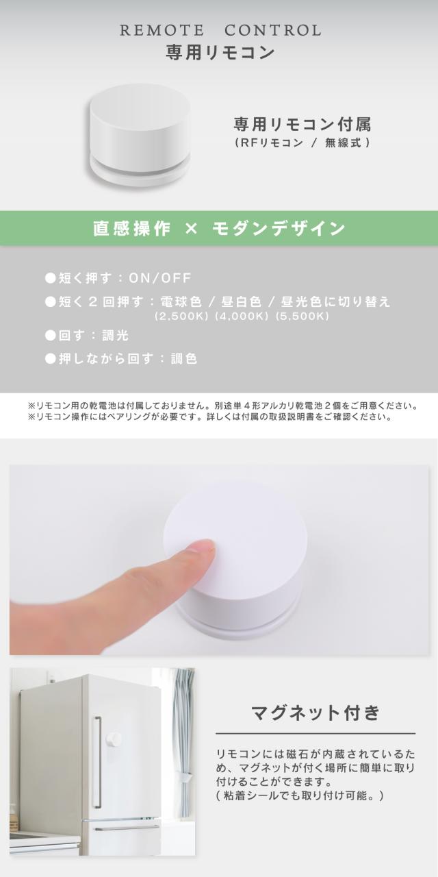 専用リモコンで調光・調色(電球色〜昼光色)ができ、時間帯や用途に合わせた光の演出が楽しめます。