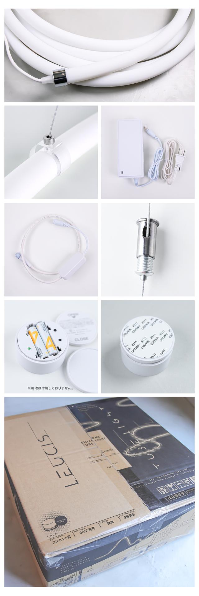 | セット内容 | LEDシリコンチューブライト×1、リモコン×1、リモコン受信ケーブル×1、ACアダプター×1、コンセントケーブル×1、吊り下げワイヤー×6、アジャスタースリーブ×7、ネジ×7、アンカー×7、取扱説明書兼保証書 ※リモコン用の乾電池は付属しておりません。別途単4形アルカリ乾電池2個をご準備ください。 |